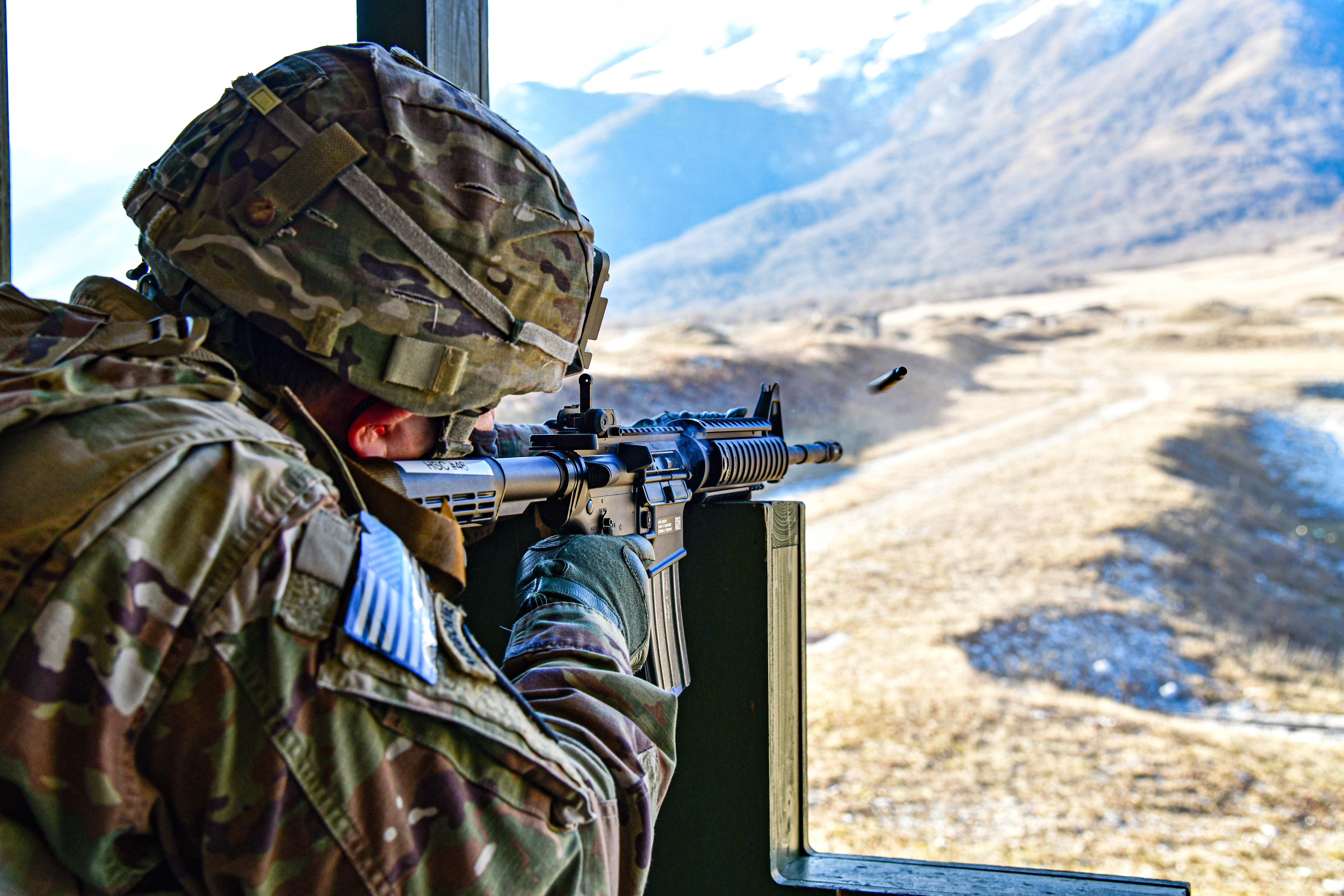 A Soldier assigned to U.S. Army Southern European Task Force, Africa engages pop-up targets with an M4 carbine during marksmanship training at Cao Malnisio Range in Pordenone, Italy, Jan. 26, 2021. (U.S. Army photo by Davide Dalla Massara)