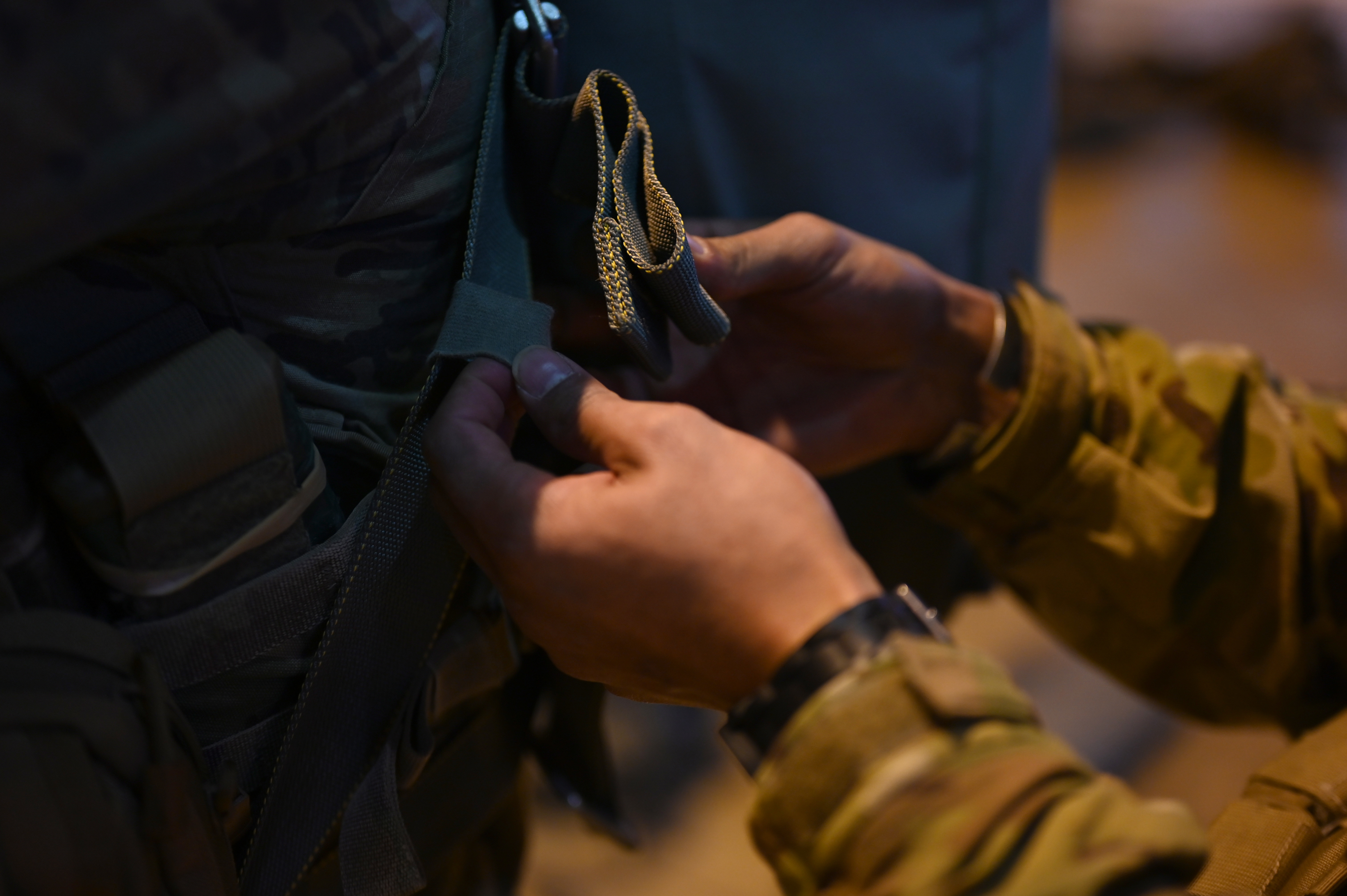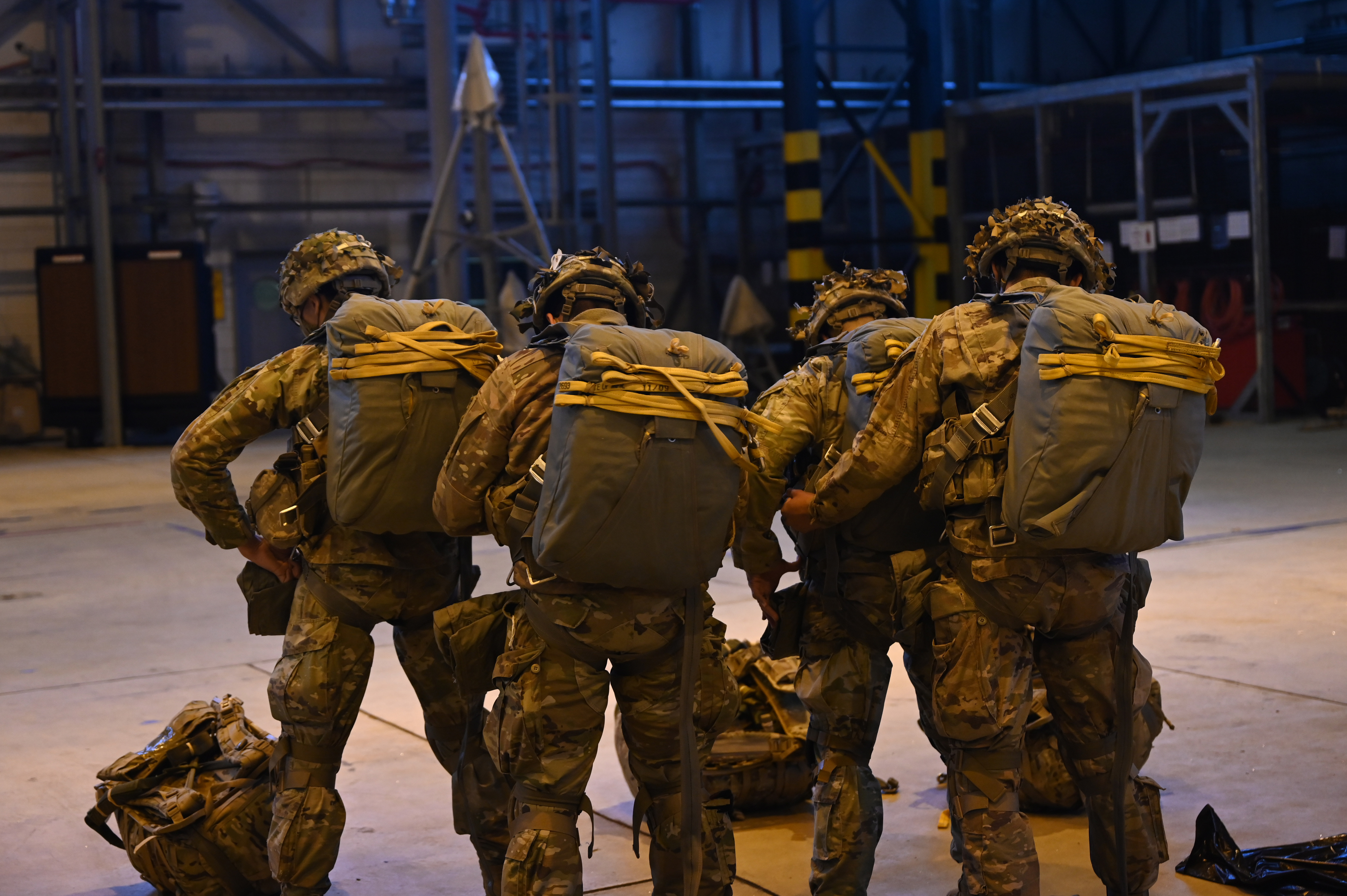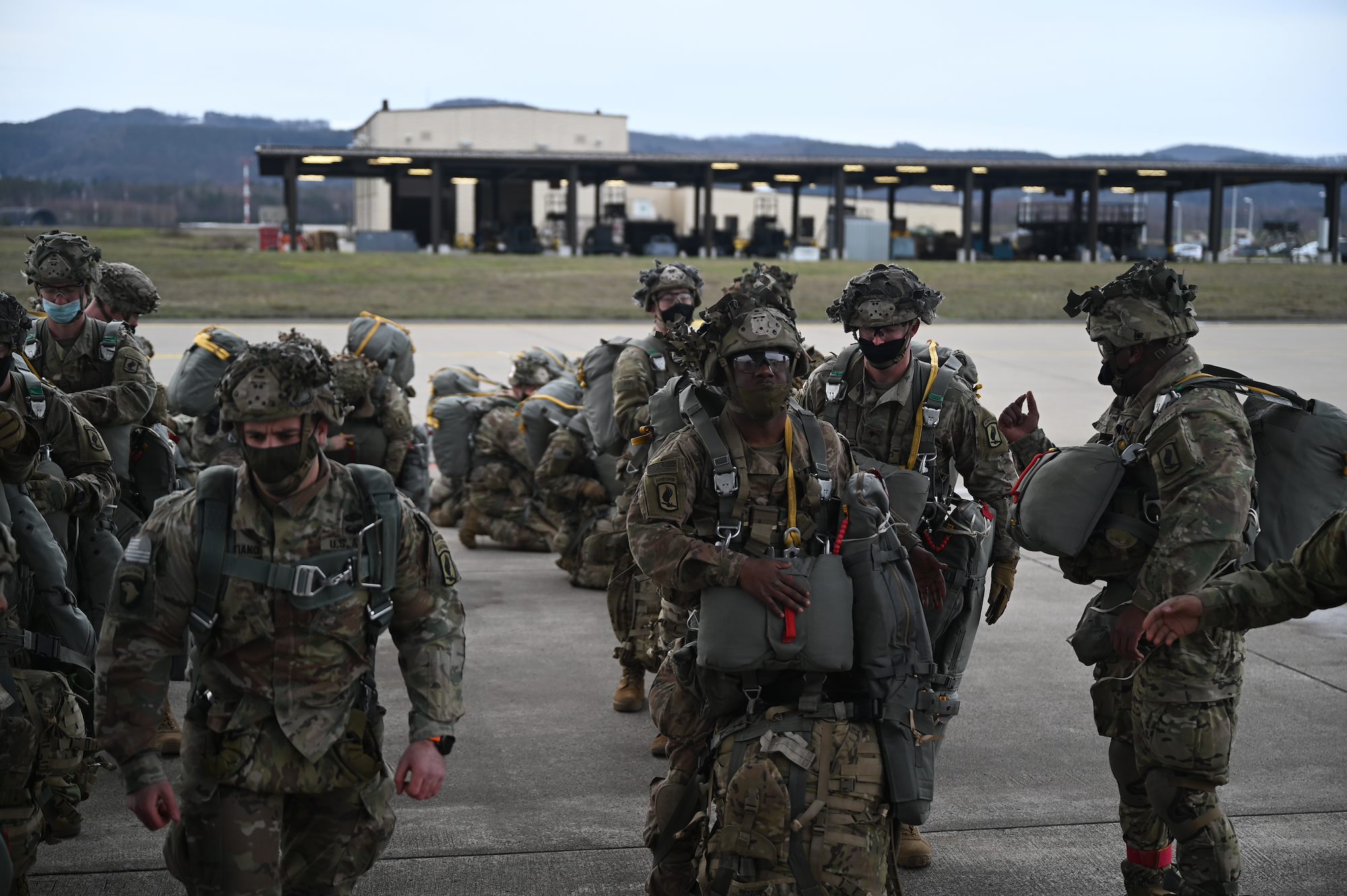U.S. Army paratroopers assigned to the 1st Squadron (Airborne), 91st Cavalry Regiment, 173rd Airborne Brigade, assigned to Grafenwoehr Training Area, Germany, conduct buddy-checks during a paratrooper briefing at Ramstein Air Base, Germany, Jan. 20, 2021. Approximately 30 paratroopers, additional personnel, numerous vehicles, containers and supply pallets deployed from Grafenwoehr to Ramstein Air Base within hours of notification. (U.S. Air Force Senior Airman Milton Hamilton)