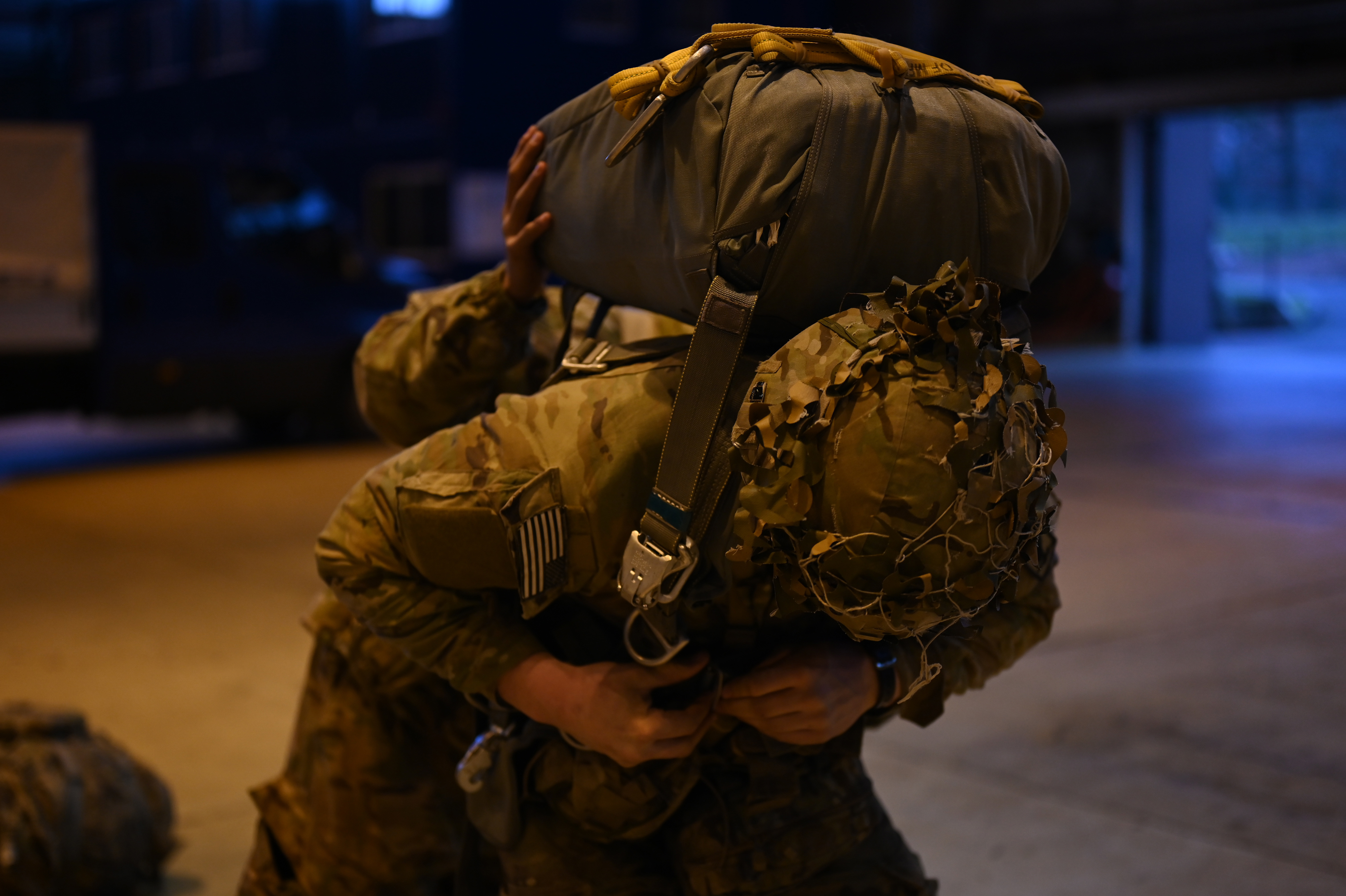 A U.S. Army paratrooper assigned to the 1st Squadron (Airborne), 91st Cavalry Regiment, 173rd Airborne Brigade, assigned to Grafenwoehr Training Area, Germany, tightens the straps of a parachute for another soldier during a buddy-check at Ramstein Air Base, Germany, Jan. 20, 2021. Once the paratroopers arrived at Ramstein they immediately initiated mission planning, joint rehearsals and the air-load process with Airmen assigned to the 37th Airlift Squadron and the 86th Logistical Readiness Squadron. (U.S. Air Force Senior Airman Milton Hamilton)
