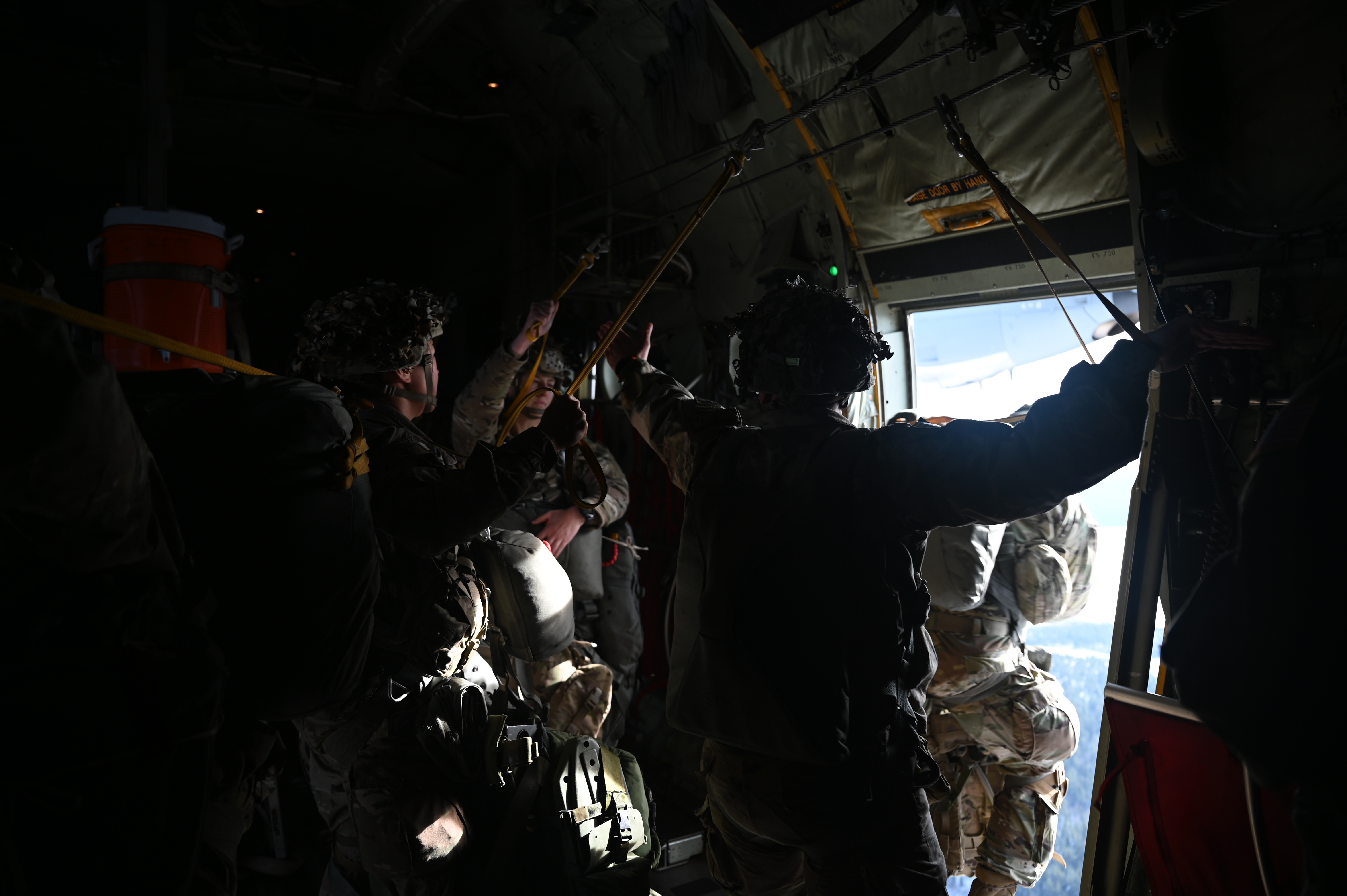 U.S. Army paratroopers assigned to the 1st Squadron (Airborne), 91st Cavalry Regiment, 173rd Airborne Brigade, assigned to Grafenwoehr Training Area, Germany, sit in a U.S. Air Force C-130J Super Hercules aircraft prior to a military static line jump, Jan. 20, 2021. The 37th Airlift Squadron, based at Ramstein Air Base, Germany, provided aircraft for approximately 116 Soldiers. (U.S. Air Force photo by Senior Airman Milton Hamilton)