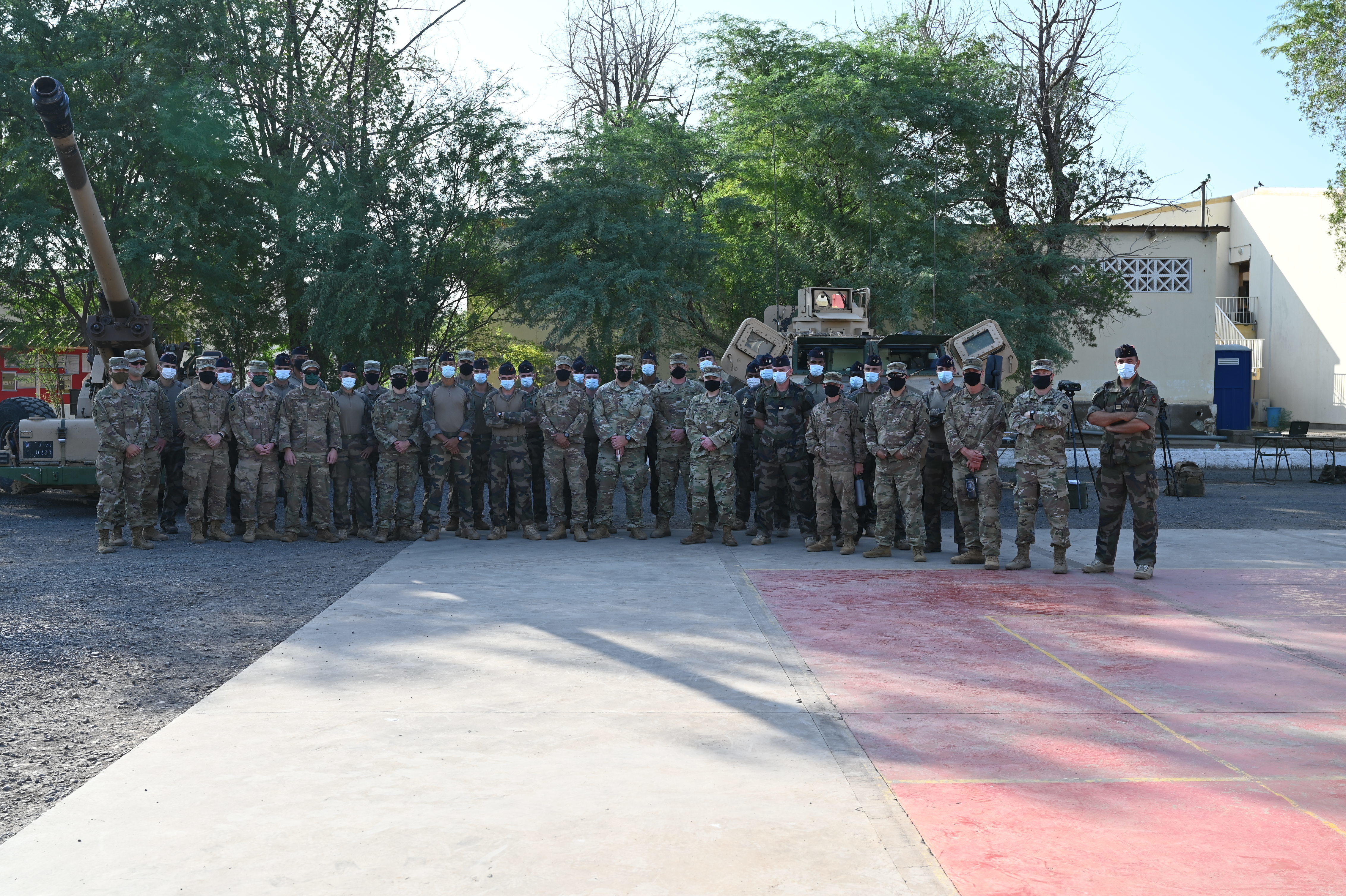 U.S. Army Soldiers assigned to the East Africa Response Force (EARF) in support of the Combined Joint Task Force-Horn of Africa (CJTF-HOA) and French Soldiers assigned to the 5th Overseas Intermarines Regiment (RIAOM) pose for a photo at the French Army Base, Djibouti, Jan 4, 2021. The purpose of the joint training was to share French and U.S. Army artillery techniques and further the relationship between EARF Soldiers and the 5th RIAOM. (U.S. Air Force photo by Tech. Sgt. Dana J. Cable)