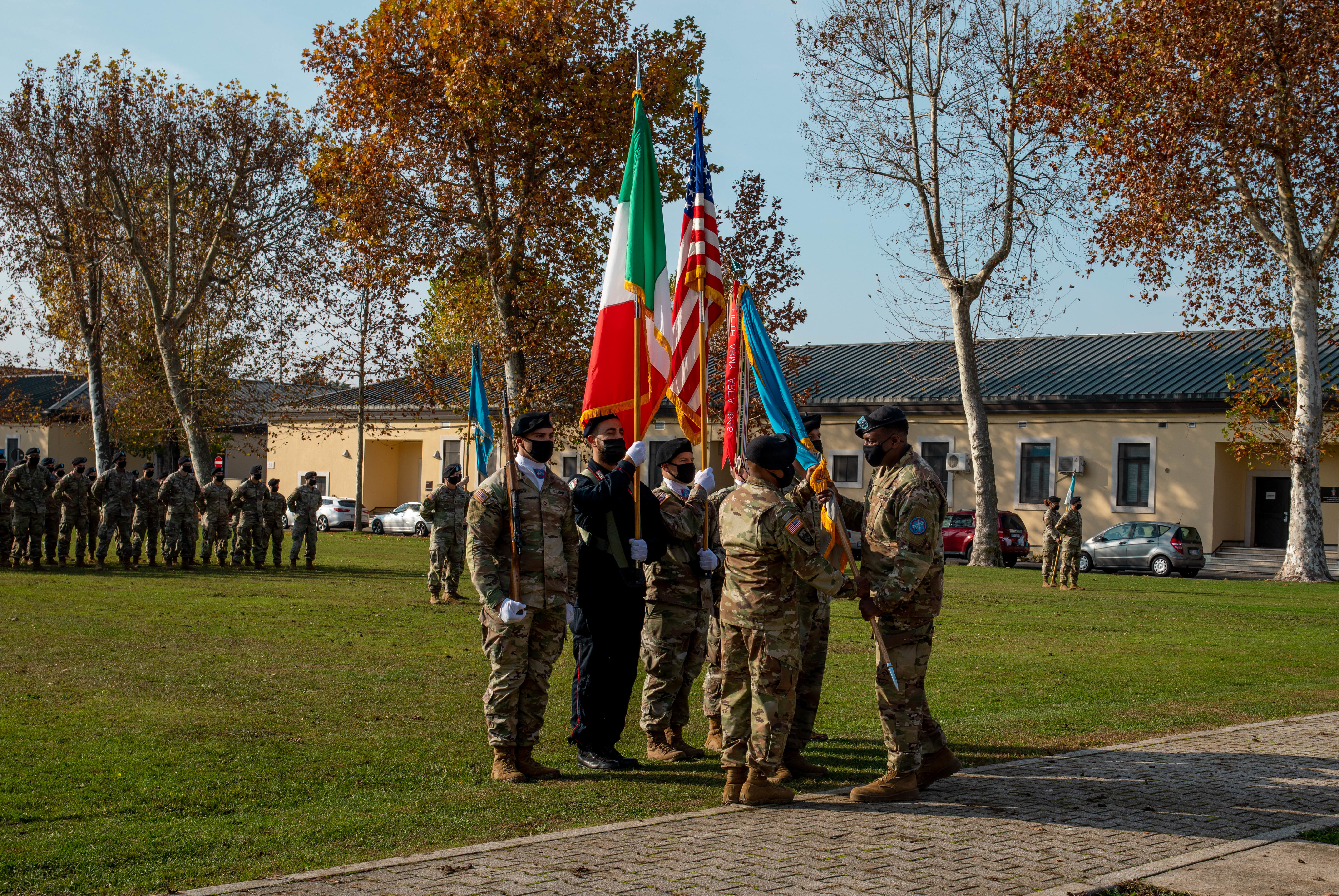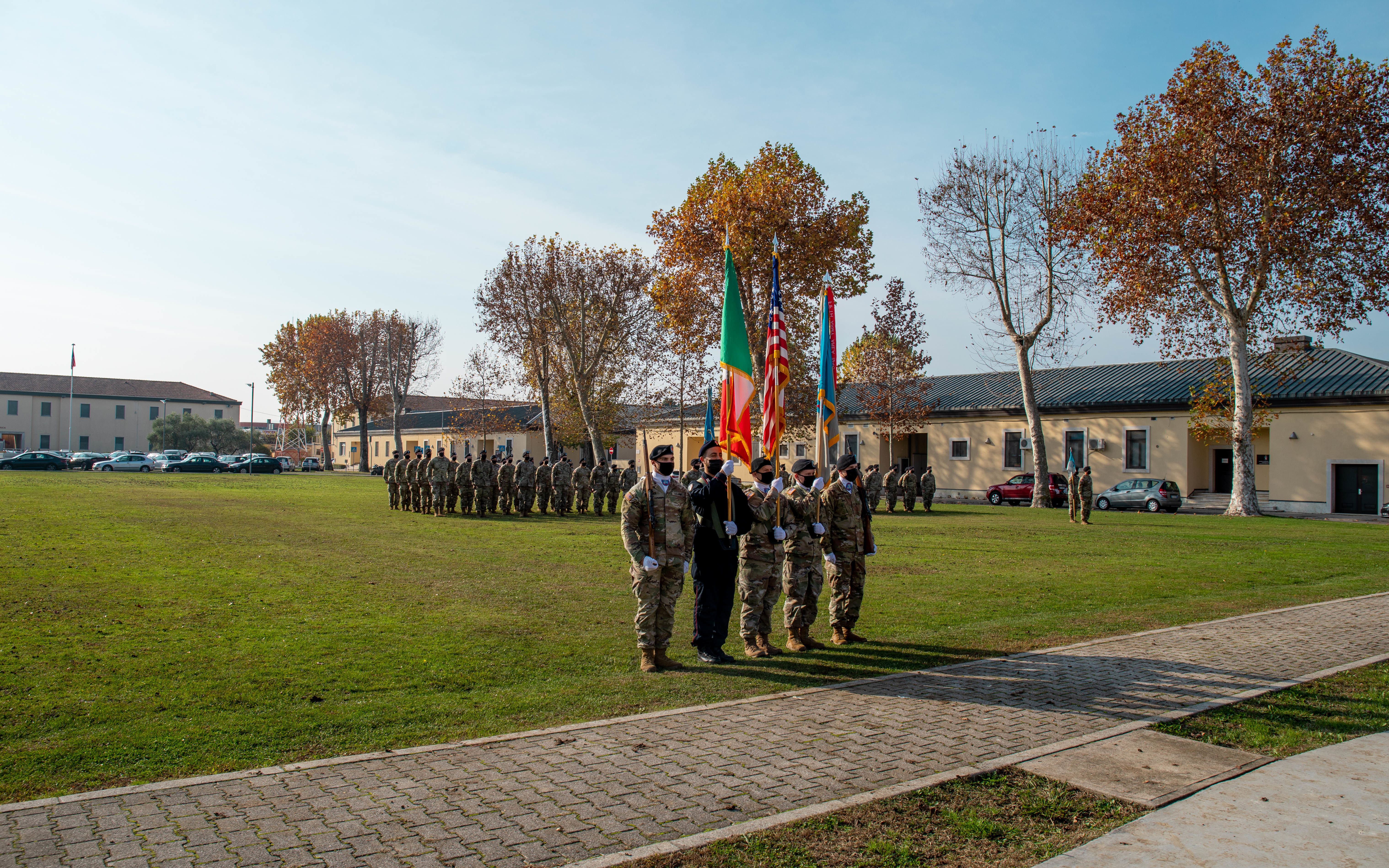 The Color Guard march out as part of the Assumption of Command for Command Sgt. Maj. Maurice Parker, incoming CSM for the 207th Military Intelligence Brigade, on Caserma Ederle, Vicenza Italy, Nov 18, 2021. Parker will be leading the 207th MIB as it continues to support U.S. ArmySouthern European Task Force, Africa, and U.S. Africa Command in ongoing missions and efforts throughout the African Continent. (U.S. Army photo by Pfc. Semaj Johnson)