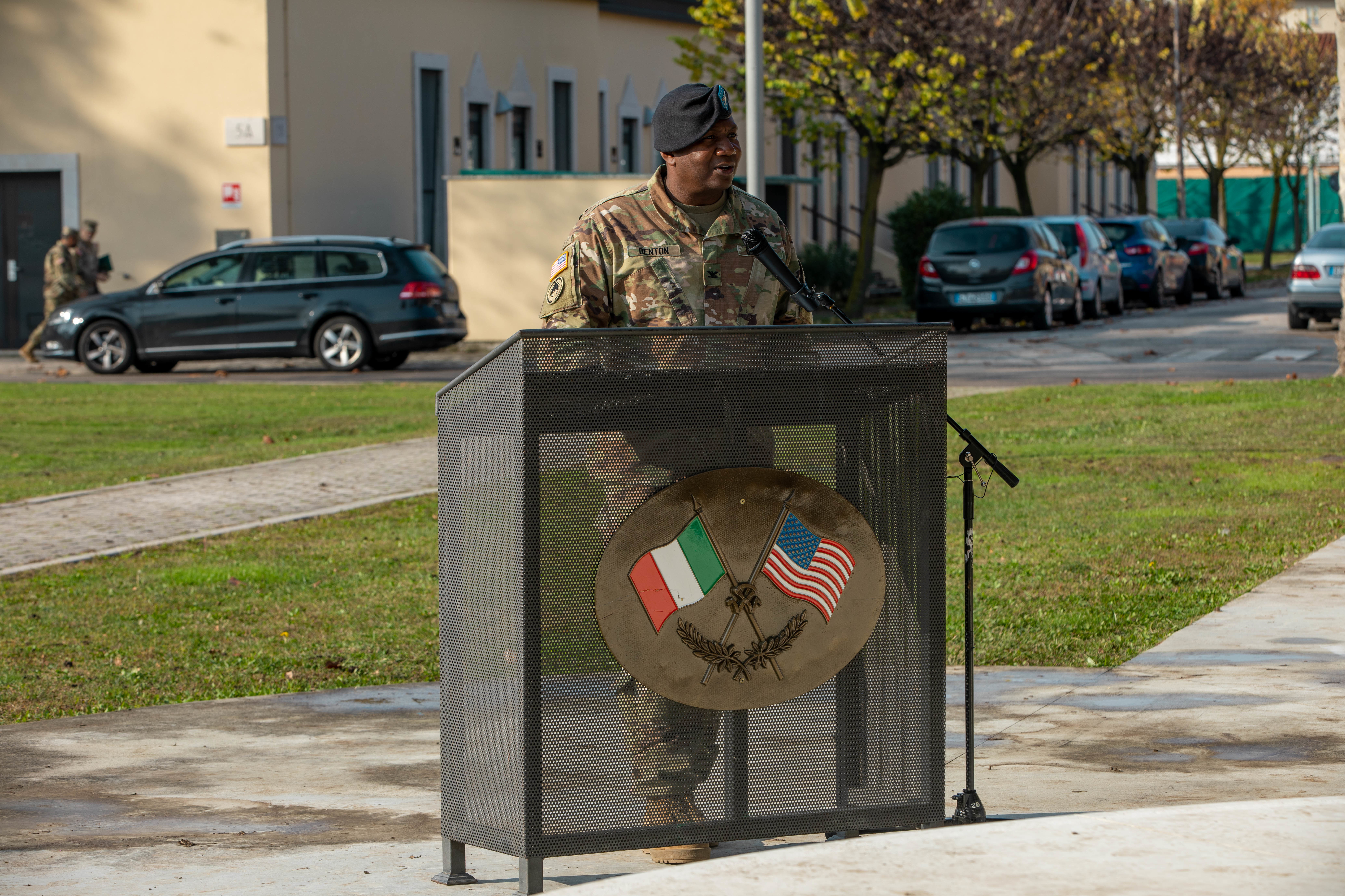 Col. Mark Denton, brigade commander of the 207th Military Intelligence Brigade, provides words of encouragement during the Assumption of Command ceremony for incoming 207th MIB Command Sgt. Maj. Maurice Parker, on Caserma Ederle, Vicenza Italy, Nov 18, 2021. Parker will be leading the 207th MIB as it continues to support U.S. Army Southern European Task Force, Africa, and U.S. Africa Command in ongoing missions and efforts throughout the African Continent. (U.S. Army photo by Pfc. Semaj Johnson)