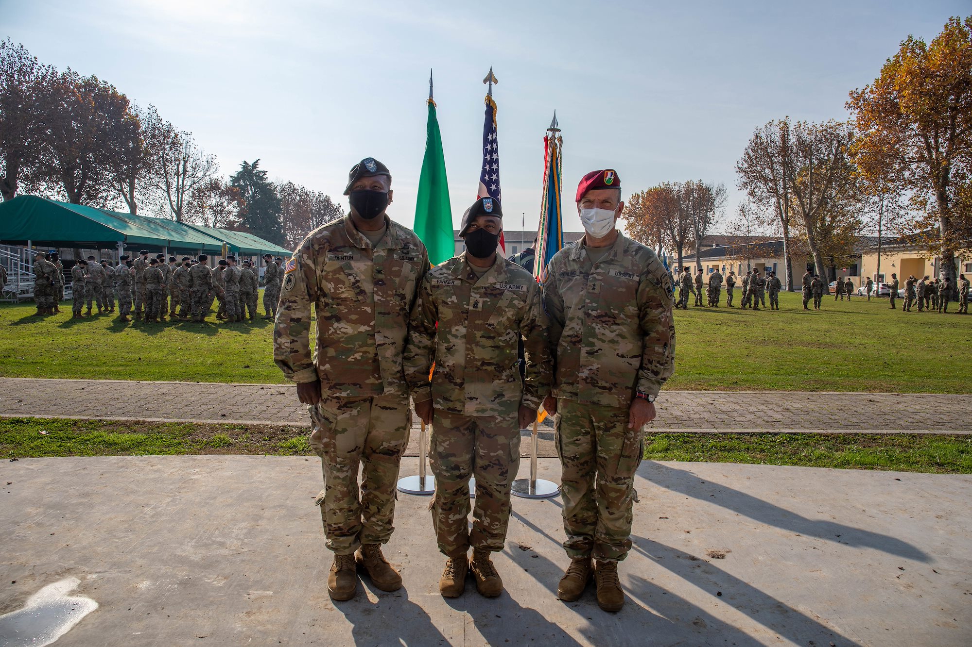 From left, Col. Mark Denton, brigade commander of the 207th Military Intelligence Brigade, Command Sgt. Maj. Maurice Parker, incoming CSM for the 207th MIB, and Maj. Gen. Andrew Rohling, commander of the Southern European Task Force, Africa, stand for a photo following an Assumption Of Command on Caserma Ederle, Vicenza Italy, Nov 18, 2021. Parker will be leading the 207th MIB as it continues to support U.S. Army Southern European Task Force, Africa, and U.S. Africa Command in ongoing missions and efforts throughout the African Continent. (U.S. Army photo by Pfc. Semaj Johnson)