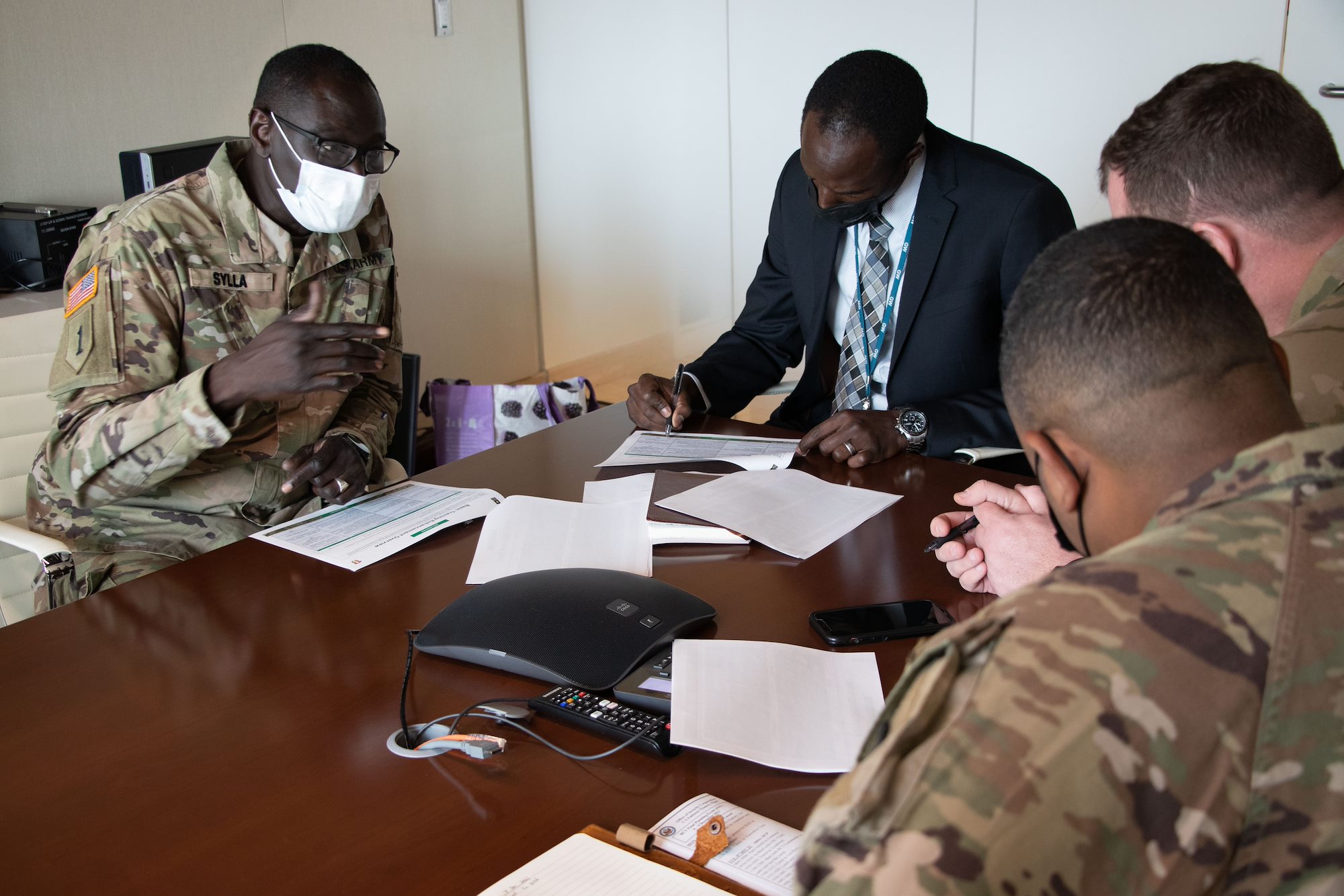 Maj. Mammadou Sylla discusses projects and plans to enhance the Forces Armées Nigériennes basic training in a meeting with the U.S. Embassy Niamey Office of Security Cooperation and the Regional Training Institute of the Indiana Army National Guard Dec. 07, 2021 in Niamey, Niger. Sylla and other security cooperation planners with U.S. Army Southern European Task Force, Africa visited Niamey Dec. 6-9 to refine plans for FAN basic training capability enhancement, part of the Trans-Sahara Counterterrorism Partnership program, scheduled to be completed before April. The RTI will train and certify the FAN basic training instructors. The project aims to standardize FAN basic training in order to provide continuity for a professional security force to counter regional threats and violent extremist organizations. The Indiana Army National Guard and Niger are matched in the National Guard and U.S. Africa Command State Partnership Program. (U.S. Army photo by Carmen Daugherty.)