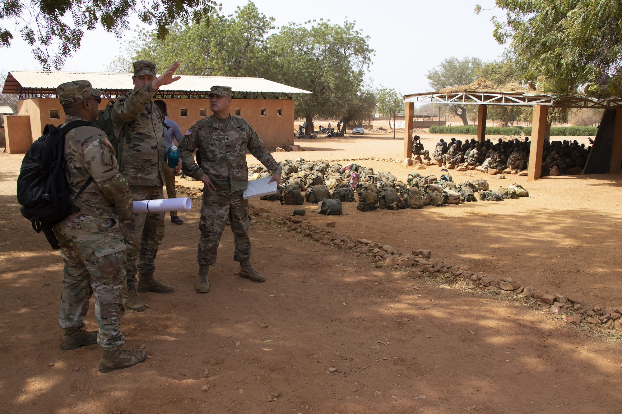 Sgt. First Class Cristobal Landecho, Sgt. First Class Brandon Ledbetter and Lt. Col. Maurice Curtis discuss plans to enhance the Niger army basic training program Dec. 7, 2021, in Niamey, Nigeria. The three Soldiers of the Indiana Army National Guard visited Niger Dec. 6-10, 2021 to coordinate details of a project to bolster the Forces Armées Nigériennes Tondibiah basic training capability. They were joined by Soldiers from the U.S. Army Southern European Task Force, Africa and representatives from the U.S. Embassy, Niamey Office of Security Cooperation. The group collaborated to finalize training plans to bring vetted program of instruction to the FAN. The goal of this program is to improve upon the existing basic combat training, develop standardized testing requirements and validate the evaluation process. The INARNG Regional Training Institute assessed the existing infrastructure, finalized training plans and refined the training requirement to enhance the FAN’s basic training program. (U.S. Army photo by Carmen Daugherty.)