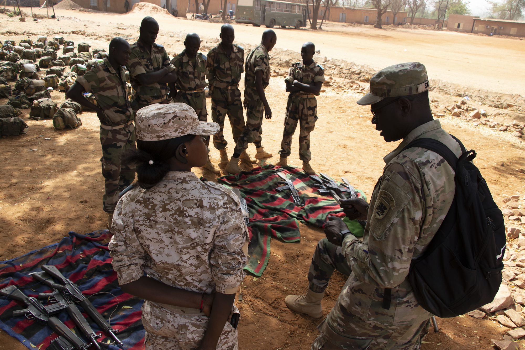 Army Maj. Mamadou Sylla talks to Niger army basic training instructors as recruits disassemble and reassemble weapons Dec. 7, 2021. Sylla led a small team from U.S. Army Southern European Task Force, Africa on a visit to Niger to discuss projects and plans to enhance the Forces Armées Nigériennes basic training in coordination with the U.S. Embassy Niamey, Office of Security Cooperation and the Regional Training Institute of the Indiana Army National Guard. The FAN basic training capability enhancement project, part of the Trans-Sahara Counterterrorism Partnership Program, is scheduled to be completed before April. Instructions from the Indiana ANG Regional Training Institute are set to train and certify the FAN basic training instructors. The project aims to standardize FAN basic training in order to provide continuity for a professional security force to counter regional threats and violent extremist organizations. The Indiana Army National Guard and Niger are matched in the National Guard and U.S. Africa Command State Partnership Program. (U.S. Army photo by Carmen Daugherty.)