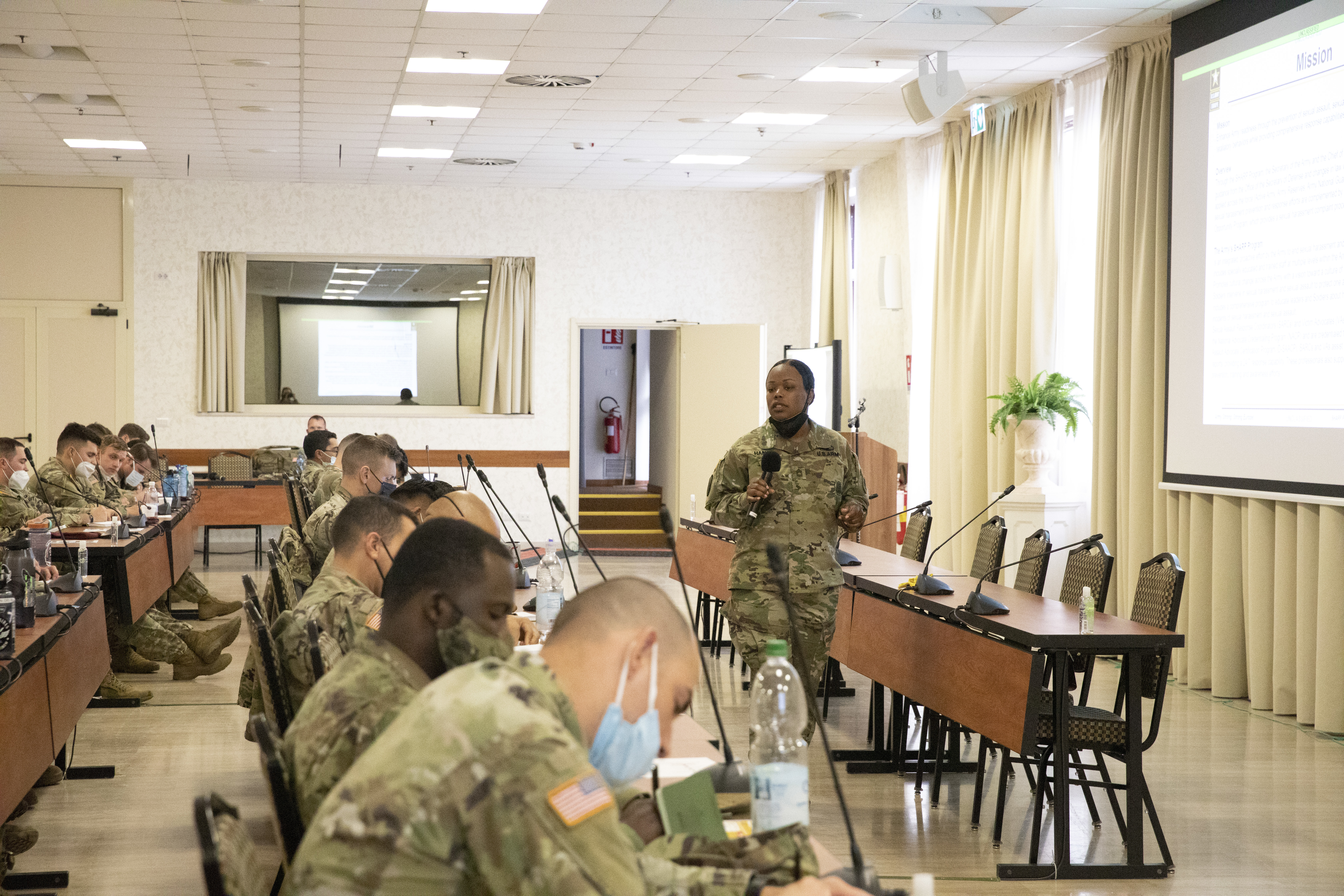 Sgt. 1st Class Natasha Handy, lead Sexual Assault Response Coordinator for U.S. Army Southern European Task Force, Africa, gives a brief during the Squad Leader Summit on Caserma Ederle in Vicenza, Italy on Aprilv22, 2022. The brief educated squad leaders on their roles and responsibilities in terms of prevention and response to sexual assault and harassment incidents within their squads.