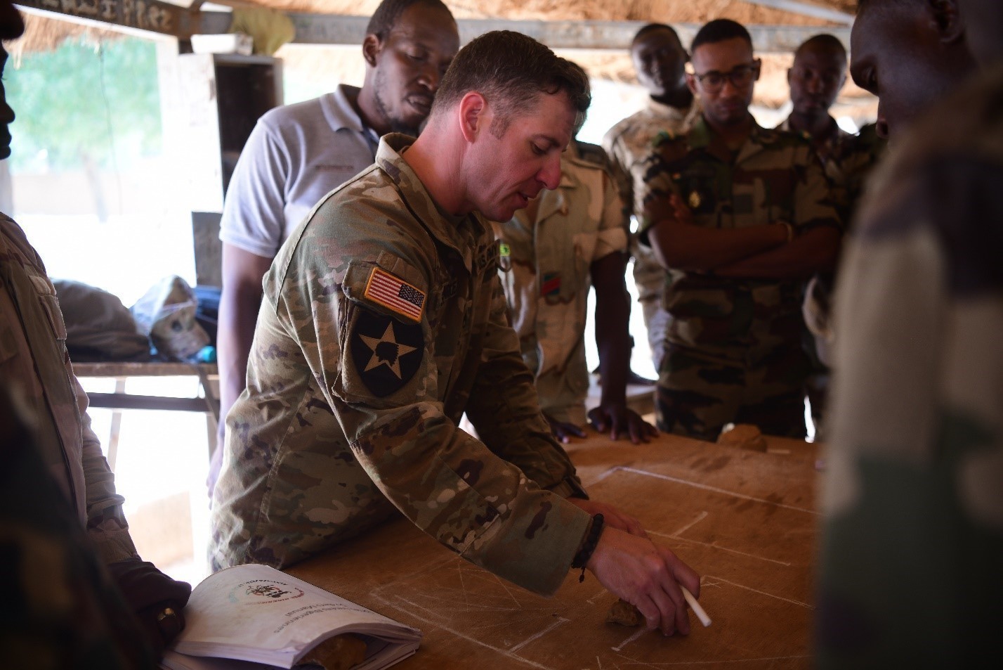 Staff Sgt. Matthew Sprague teaches a class on room clearing to members of the Forces Armées Nigériennes during the Basic Training Enhancement Program (BTEP), March 26, 2022, in Niamey, Niger. The purpose of the BTEP is to standardize basic training by using the newly developed Soldier Manual that includes selected critical combat tasks to enable FAN Soldiers to shoot, move, communicate and survive. (U.S. Army photo by Sgt. Jared Kindlespire)