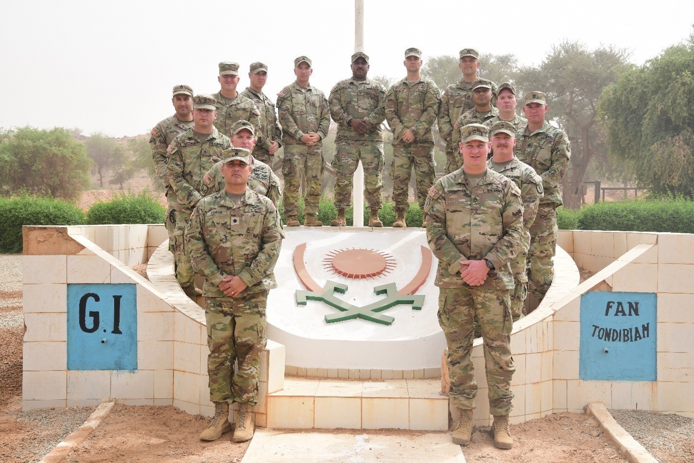 Instructors with the 138th Regional Training Institute (RTI), Indiana National Guard pose for a group photo during graduation practice of the Basic Training Enhancement Program (BTEP), March 26, 2022, in Niamey, Niger. The purpose of the BTEP is to standardize basic training by using the newly developed Soldier Manual that includes selected critical combat tasks to enable FAN Soldiers to shoot, move, communicate and survive. (U.S. Army photo by Sgt. Jared Kindlespire)