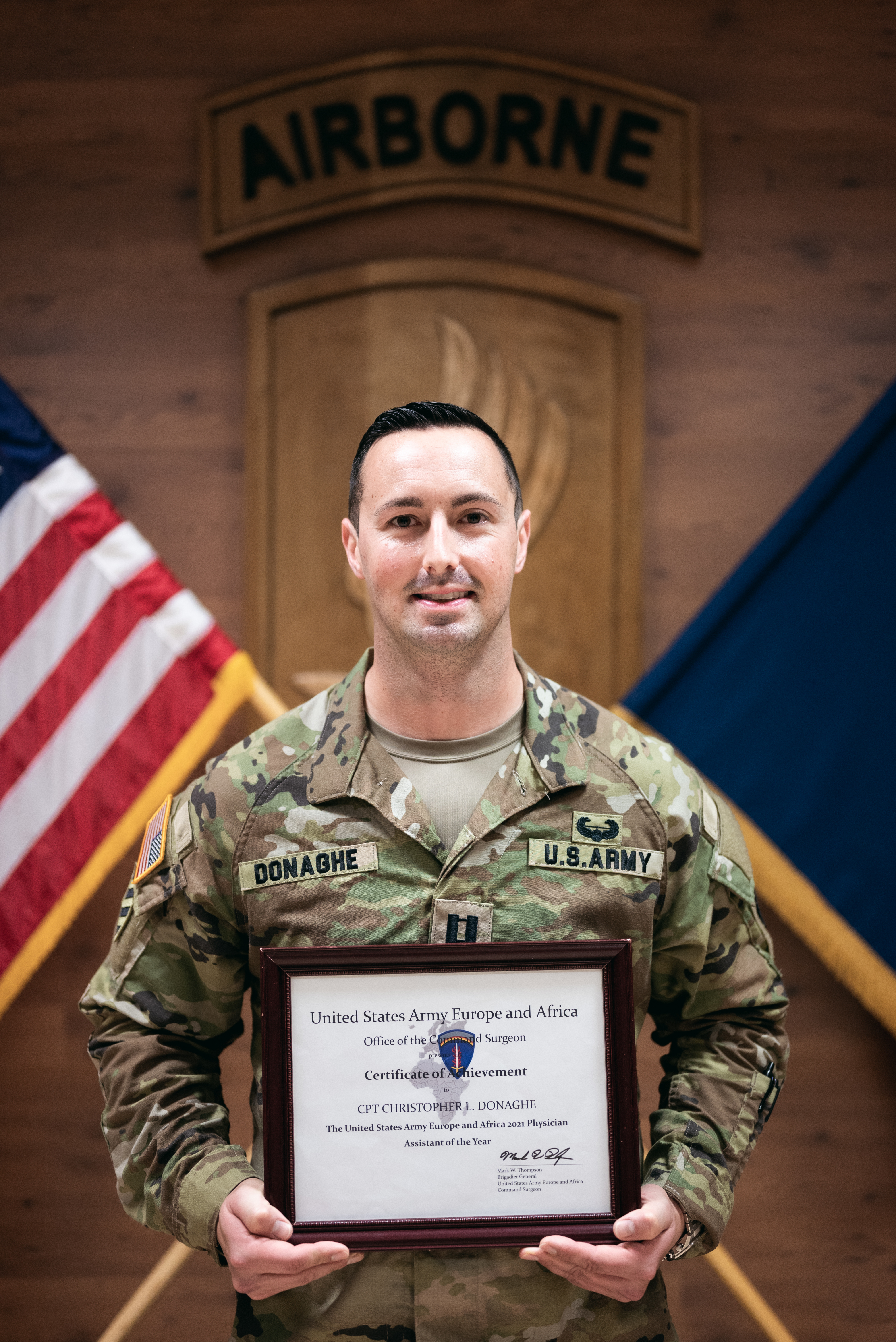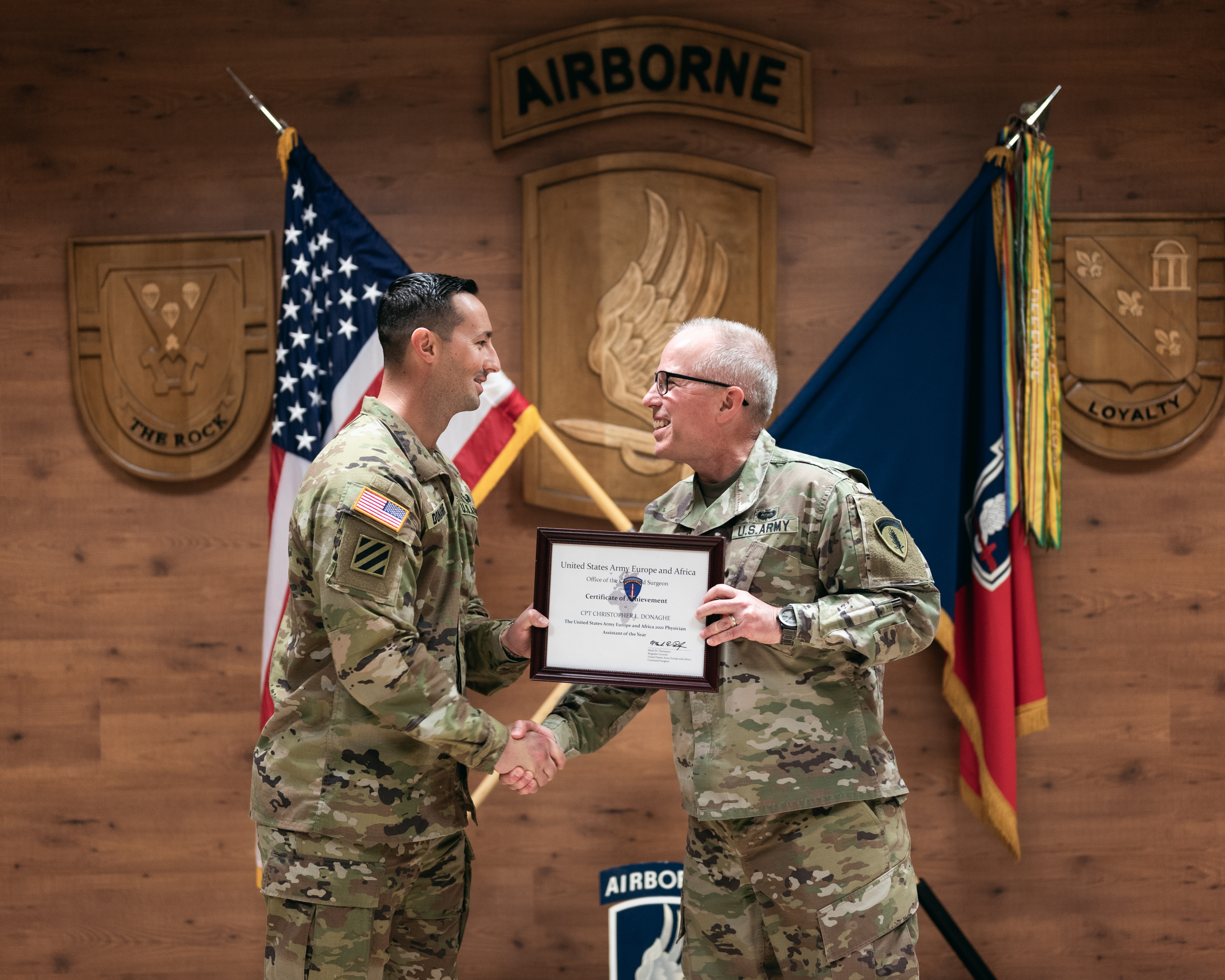 On May 20, Capt. Donaghe officially received the U.S. Army Europe and Africa (USAREUR-AF) 2021 Physician Assistant of the Year Award. The Commanding General of Regional Health Command Europe and Command Surgeon of USAREUR-AF, Brig. Gen. Mark Thompson traveled to Vicenza to present Donaghe with his well-deserved award for his selfless care of hundreds of Sky Soldiers.