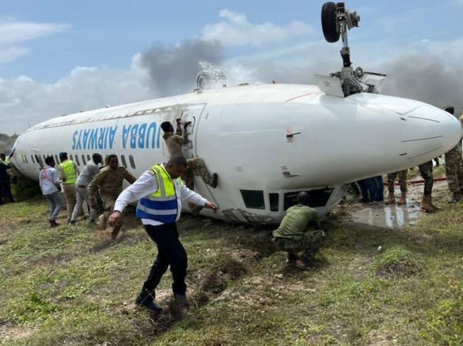 Somalia Danab brigade commandos and other first responders rush to evacuate passengers from Jubba Airlines aircraft that crash-landed July 18, 2022, at Mogadishu International Airport, Mogadishu, Somalia. Three U.S. Army 2nd Security Force Assistance Brigade Soldiers out of Fort Bragg, N.C., helped first responders care for injured passengers. The Soldiers were conducting medical training with a platoon of Somalia’s Danab commandos when the aircraft crash-landed at Mogadishu International Airport at 10:30 a.m. While the Danab commandos rushed toward the scene to pull injured passengers from the aircraft, the three American SFAB team members established a triage station about 100 meters from the crash site and assisted local emergency responders to evacuate 16 injured passengers to nearby medical facilities. (U.S. Army photo)