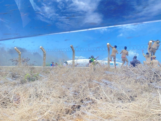 Somalia Danab brigade commandos climb a fence to get to a Jubba Airlines aircraft that crash-landed July 18, 2022, at Mogadishu International Airport, Mogadishu, Somalia. Three U.S. Army 2nd Security Force Assistance Brigade Soldiers out of Fort Bragg, N.C., helped first responders care for injured passengers. The Soldiers were conducting medical training with a platoon of Somalia’s Danab commandos when the aircraft crash-landed at Mogadishu International Airport at 10:30 a.m. While the Danab commandos rushed toward the scene to pull injured passengers from the aircraft, the three American SFAB team members established a triage station about 100 meters from the crash site and assisted local emergency responders to evacuate 16 injured passengers to nearby medical facilities. (U.S. Army photo)