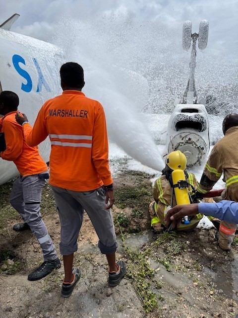 Somali first responders extinguish fire on a Jubba Airlines aircraft July 18, 2022, at Mogadishu International Airport, Mogadishu, Somalia. Three U.S. Army 2nd Security Force Assistance Brigade Soldiers out of Fort Bragg, N.C., helped first responders care for injured passengers. The Soldiers were conducting medical training with a platoon of Somalia’s Danab commandos when the aircraft crash-landed at Mogadishu International Airport at 10:30 a.m. While the Danab commandos rushed toward the scene to pull injured passengers from the aircraft, the three American SFAB team members established a triage station about 100 meters from the crash site and assisted local emergency responders to evacuate 16 injured passengers to nearby medical facilities. (U.S. Army photo)