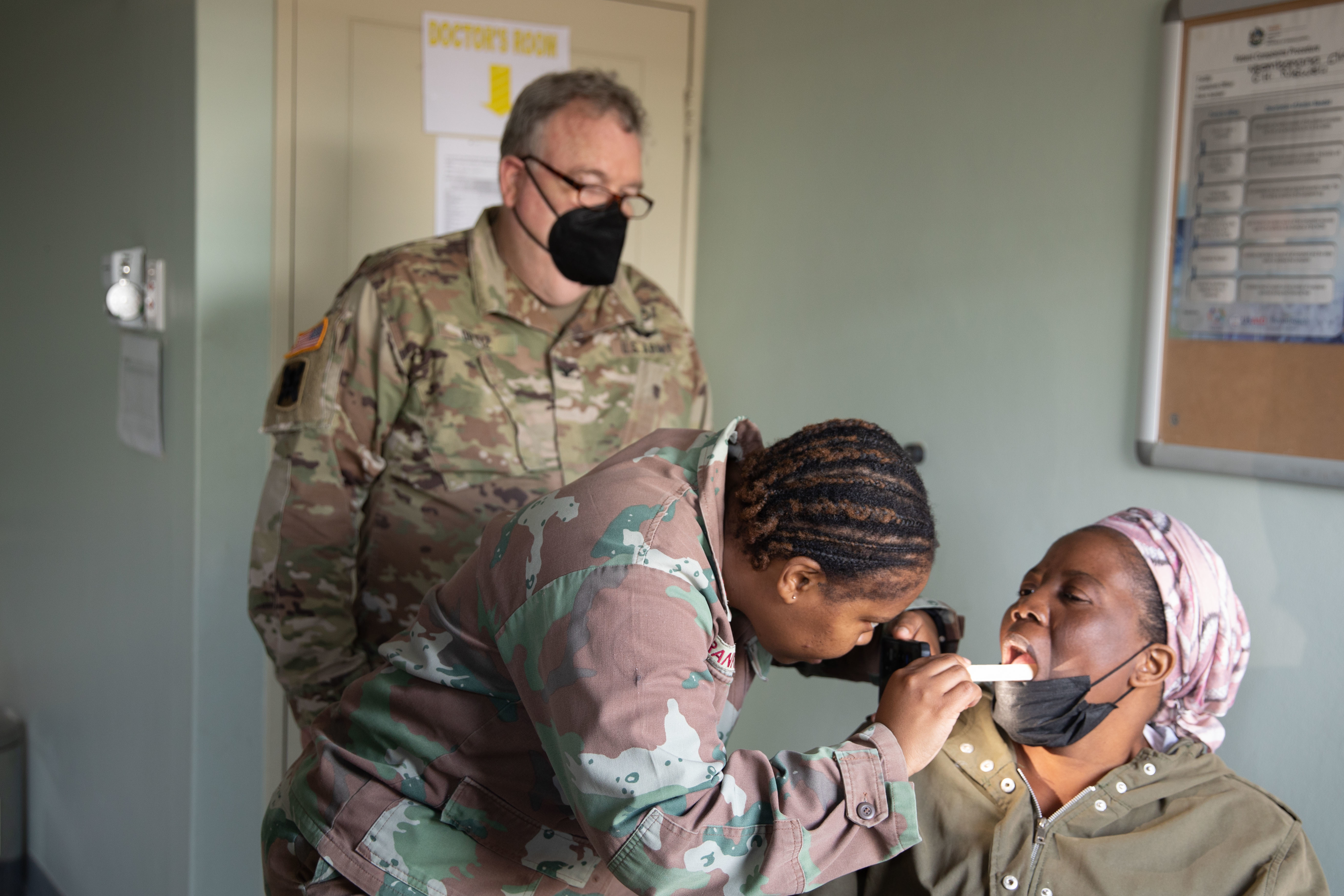A South African National Defense Force dentist examines a patient with Col. Martin Ortiz, a pediatrician with the New York Army National Guard, during a medical readiness exercise July 11, 2022 at the Buchanana Clinic in Ntambanana, South Africa. The medical readiness exercise, or MEDREX, combines U.S. Army and African medical providers for a three week medical exchange. The MEDREX is part of Exercise Shared Accord in South Africa. (U.S. Army photo by Pfc. Mariajose Licea)