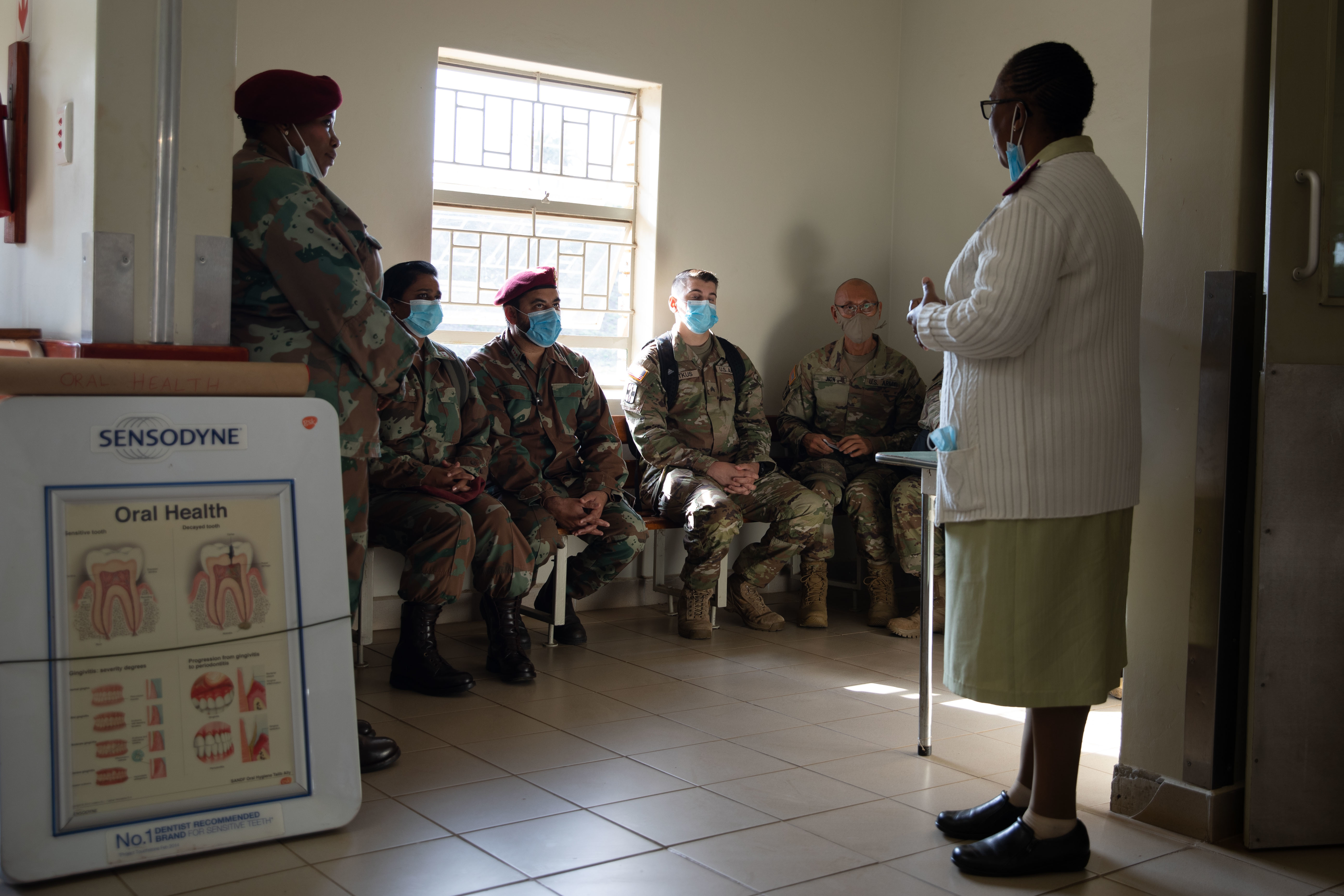 A doctor at the Buchanana Clinic in Ntambanana, South Africa, briefs members of the U.S. Army and South African National Defense Force during the start of Exercise Shared Accord 2022 on July 11, 2022 in the KwaZulu-Natal province, S. Africa. A key part of Shared Accord 2022 is a medical training exercise, planned and executed by the United States Army Southern European Task Force, Africa, that allow military medical personnel from the U.S. Army and their African Partners to exchange medical practices, procedures and techniques that build and strengthen treatment capabilities, resulting in lasting relationships between medical professionals. (U.S. Army photo by Pfc. Mariajose Licea)