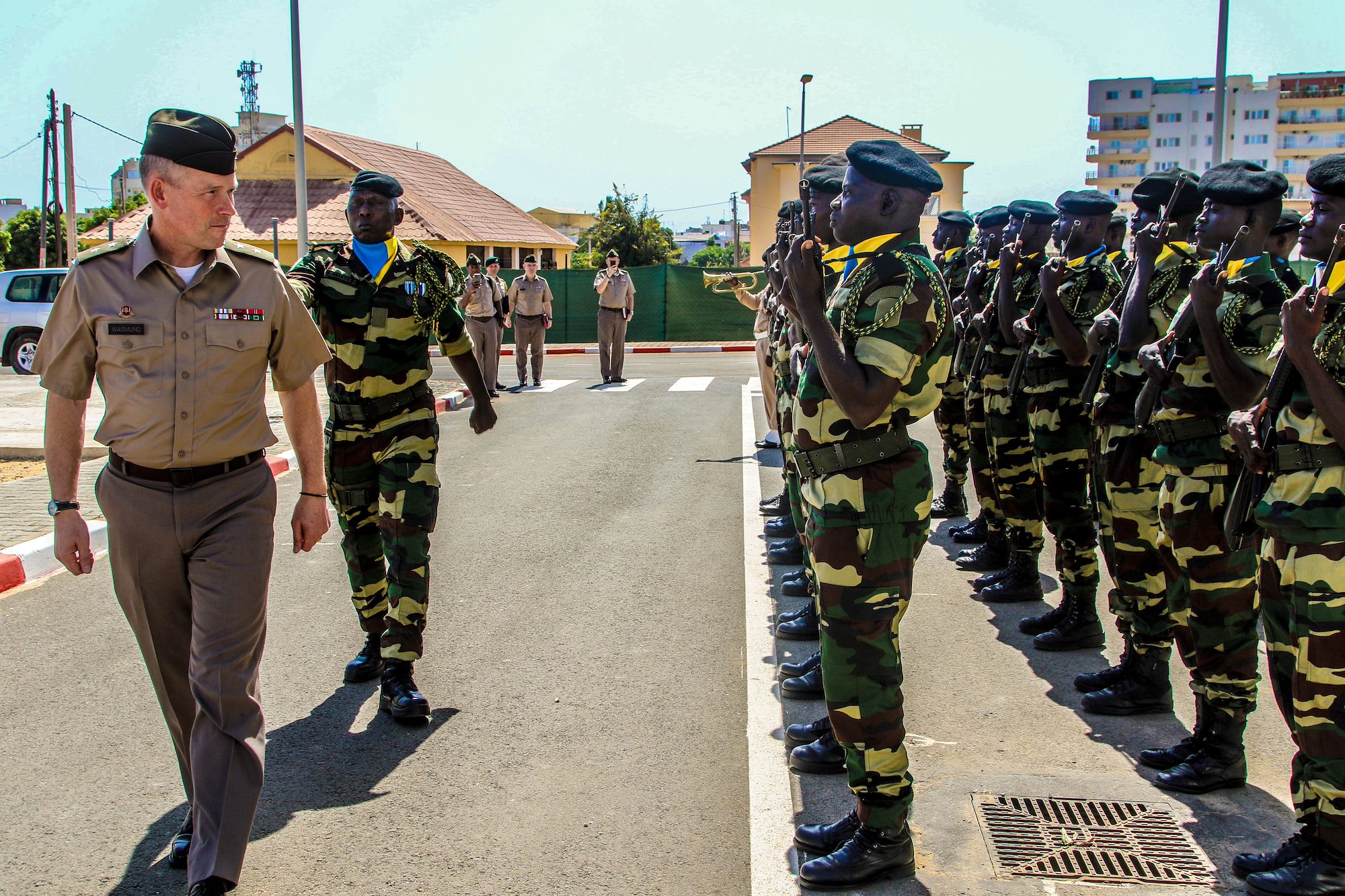 Senegalese Armed Forces soldiers welcome U.S. Army Southern European Task Force, Africa Commander Maj. Gen. Todd Wasmund (center) with an honor guard Dec. 8, 2022 during a visit to the Senegal Defense Institute hosted by Institute Director Brig. Gen. Koly Faye (left) in Dakar, Senegal. Wasmund visited army leaders in Senegal to discuss land forces cooperation and shared priorities.