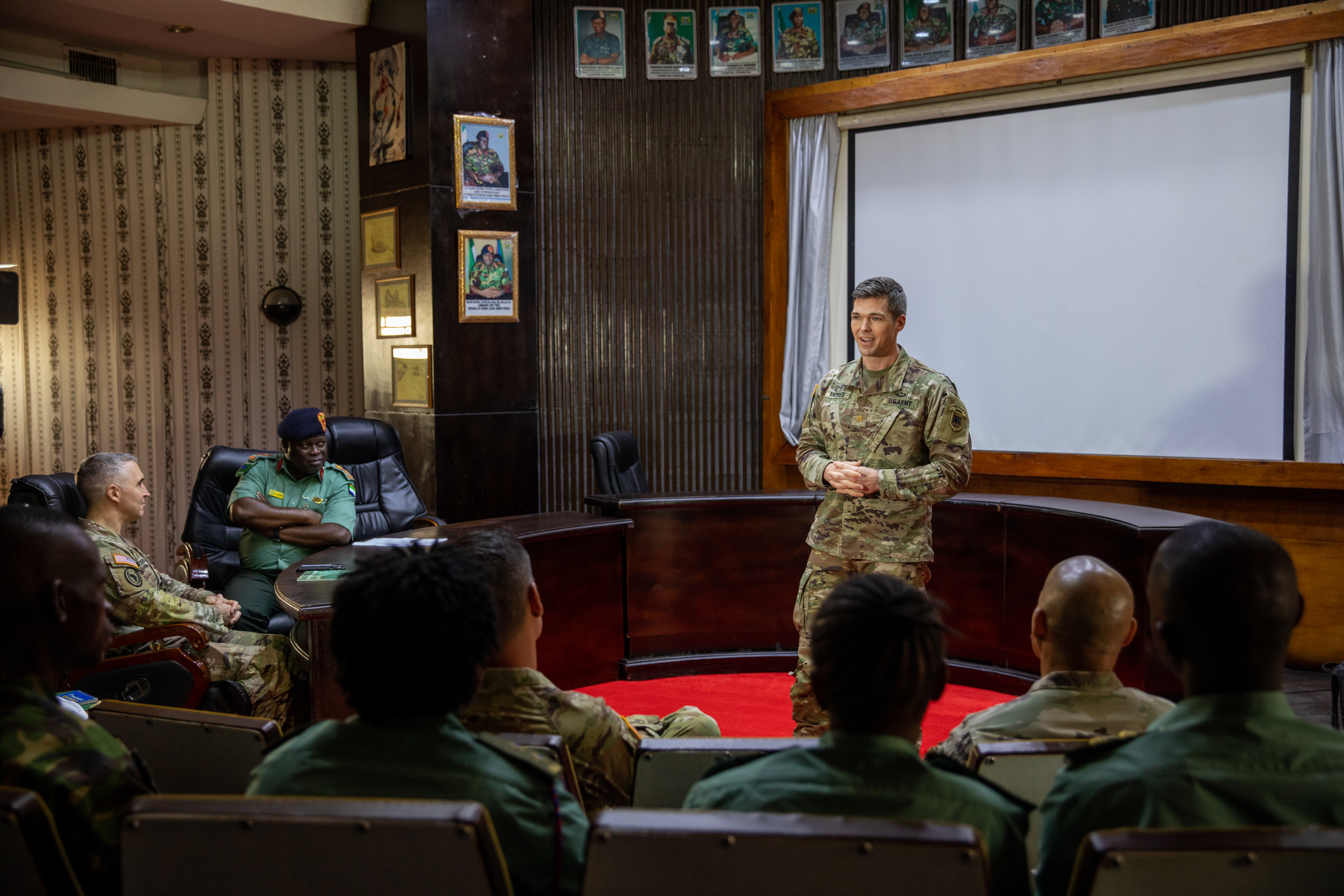 Maj. Gen. Duada Alpha, Joint Force Command, Republic of Sierra Leone Armed Forces (RSLAF) commander, speaks to public affairs officers and noncommisioned officers from U.S. Army Southern European Task Force, Africa (SETAF-AF) and Combined Joint Task Force - Horn of Africa Public Affairs Offices and RSLAF during an information sharing session on country specific public affairs procedures and practices at Joint Force Command, Freetown, Sierra Leone on 12 April, 2023. This engagement is part of the U.S. Africa Command's ongoing M2M familiarization program. AFRICOM conducts M2Ms throughout the year designed to bring together countries to exchange best practices in a particular specialty to enhance their ability to work together and understand how to operate in a specific environment. (U.S. Army photo by Staff Sgt. Luke Wilson)