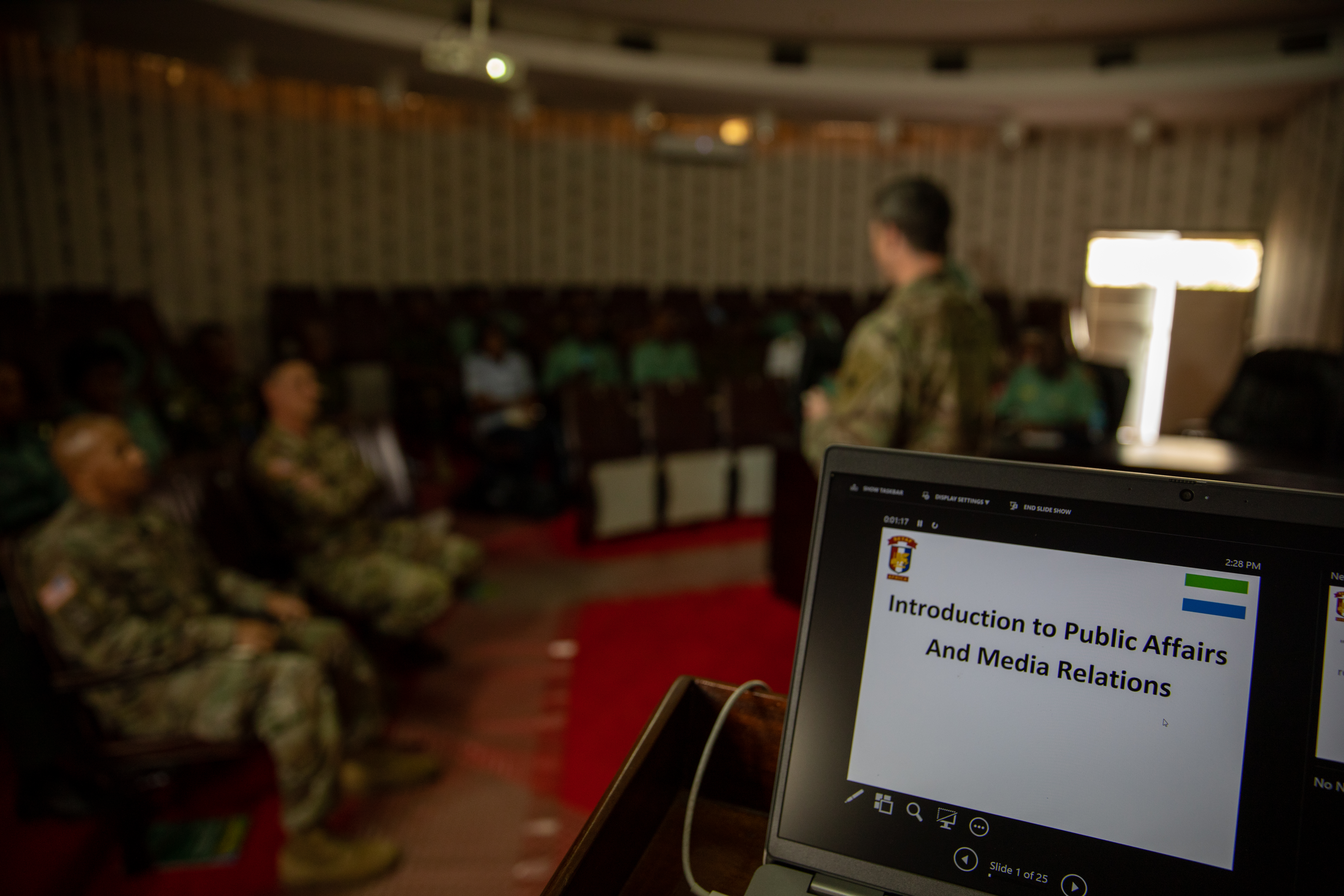 FREETOWN, Sierra Leone -- A team of public affairs experts from the U.S. Army Southern European Task Force, Africa (SETAF-AF) and Combined Joint Task Force - Horn of Africa (CJTF - HOA) exchanged best practices and procedures with members of the Republic of Sierra Leone Armed Forces (RSLAF) at the Joint Force Command in Freetown, Sierra Leone, Apr. 11-13. Officers and noncommissioned officers from both the U.S. and Sierra Leonean militaries participated in the military-to-military exchange.