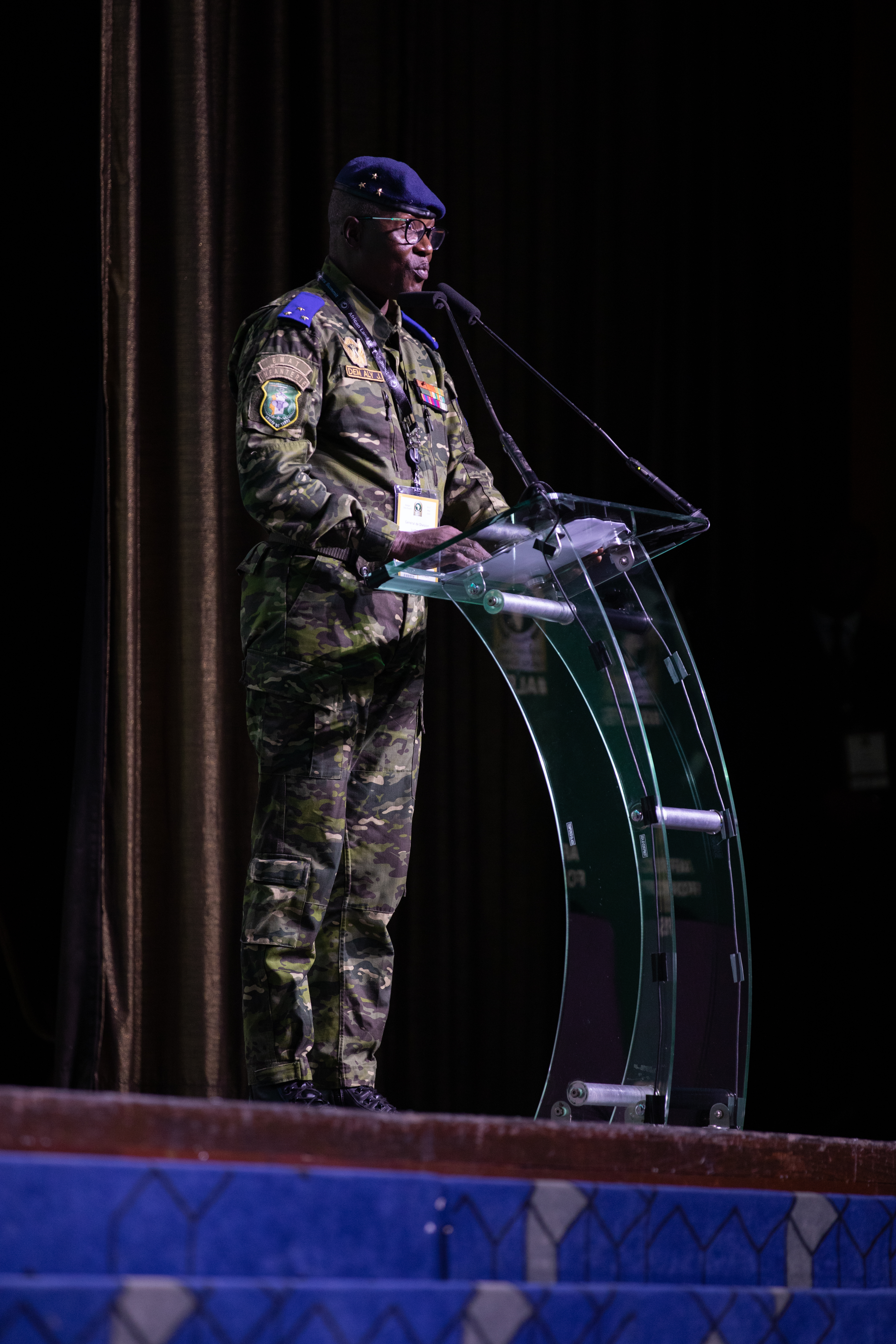 Maj. Gen. Aly J. Dem, Chief of Staff of the Army, Forces Armées de Côte d'Ivoire (FACI) [Armed Forces of Côte D’Ivoire], speaks at the opening ceremony of the African Land Forces Summit (ALFS) 2023 in Abidjan, Côte d'Ivoire, May 8, 2023. ALFS 2023 brings together senior land forces leaders from across Africa and other partner nations to solidify relationships, exchange information on current topics of mutual interest and encourage cooperation in addressing challenges. (U.S. Army photo by Spc. Zachery Frost)