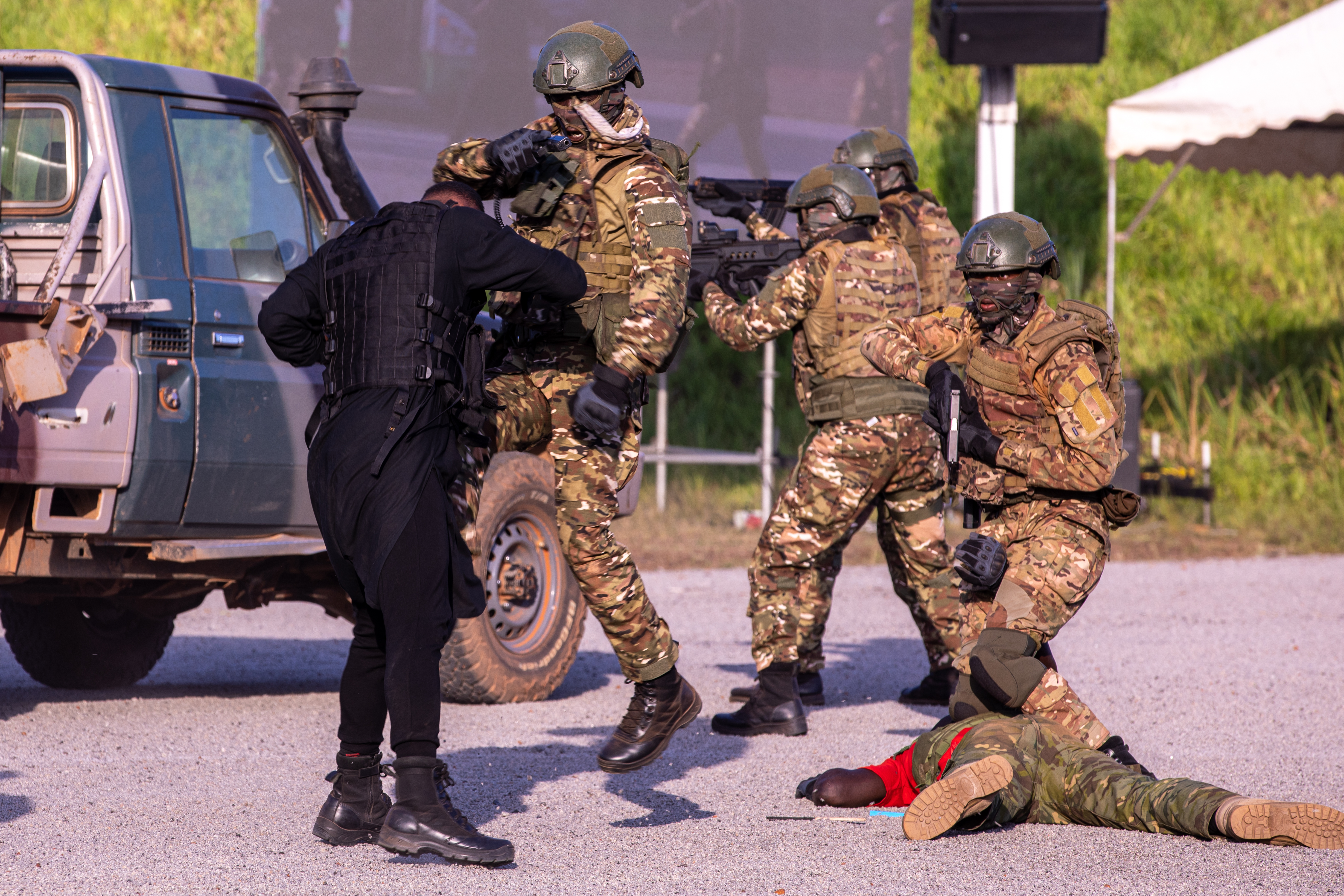 Armed Forces of Côte d'Ivoire soldiers from the l'Académie Internationale de Lutte Contre le Terrorisme (AILCT), display their capabilities against domestic-terrorism during a demonstration showing a hostage rescue scenario for the African Land Forces Summit (ALFS) 2023, Abidjan, Côte d'Ivoire, May 9, 2023. Sponsored by the U.S. Army Chief of Staff and co-hosted by the U.S. Army Southern European Task Force, Africa and the Armed Forces of Côte d'Ivoire, ALFS 2023 brings together senior leaders from across Africa and other partner nations, May 8-12, to solidify relationships, exchange information on current topics of mutual interest and encourage cooperation in addressing challenges. This year’s theme is “Addressing security challenges through civil-military partnerships.” (U.S. Army photo by Spc. Zachery Frost)