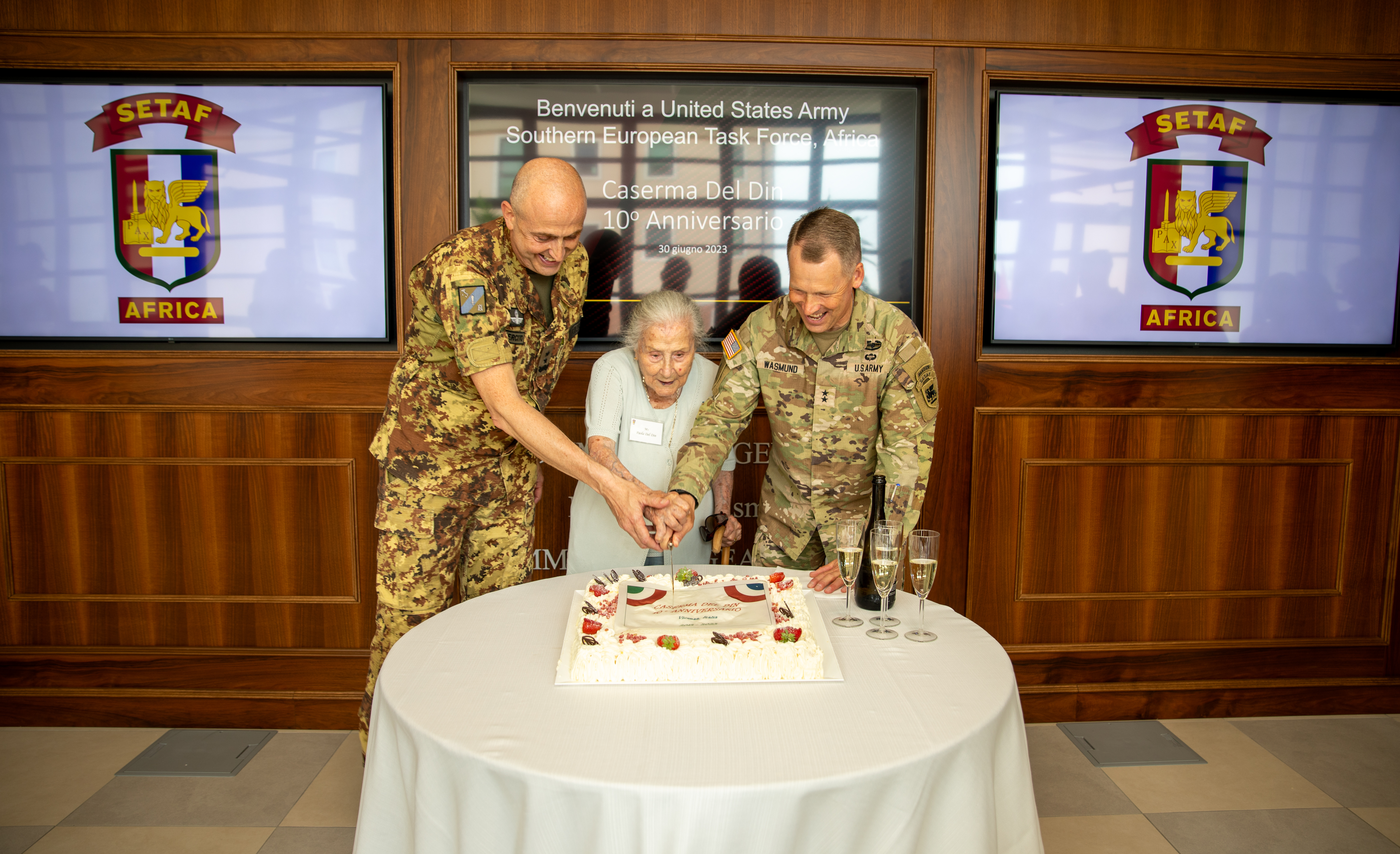 VICENZA, Italy -- U.S. Army Southern European Task Force, Africa (SETAF-AF), U.S. Army Garrison Italy, 173rd Airborne Brigade, Italian military and civilian leaders across the Vicenza community, joined the guest of honor, Paola Del Din, at the 10th anniversary of the opening of Caserma Del Din military installation in Vicenza, June 30, 2023.