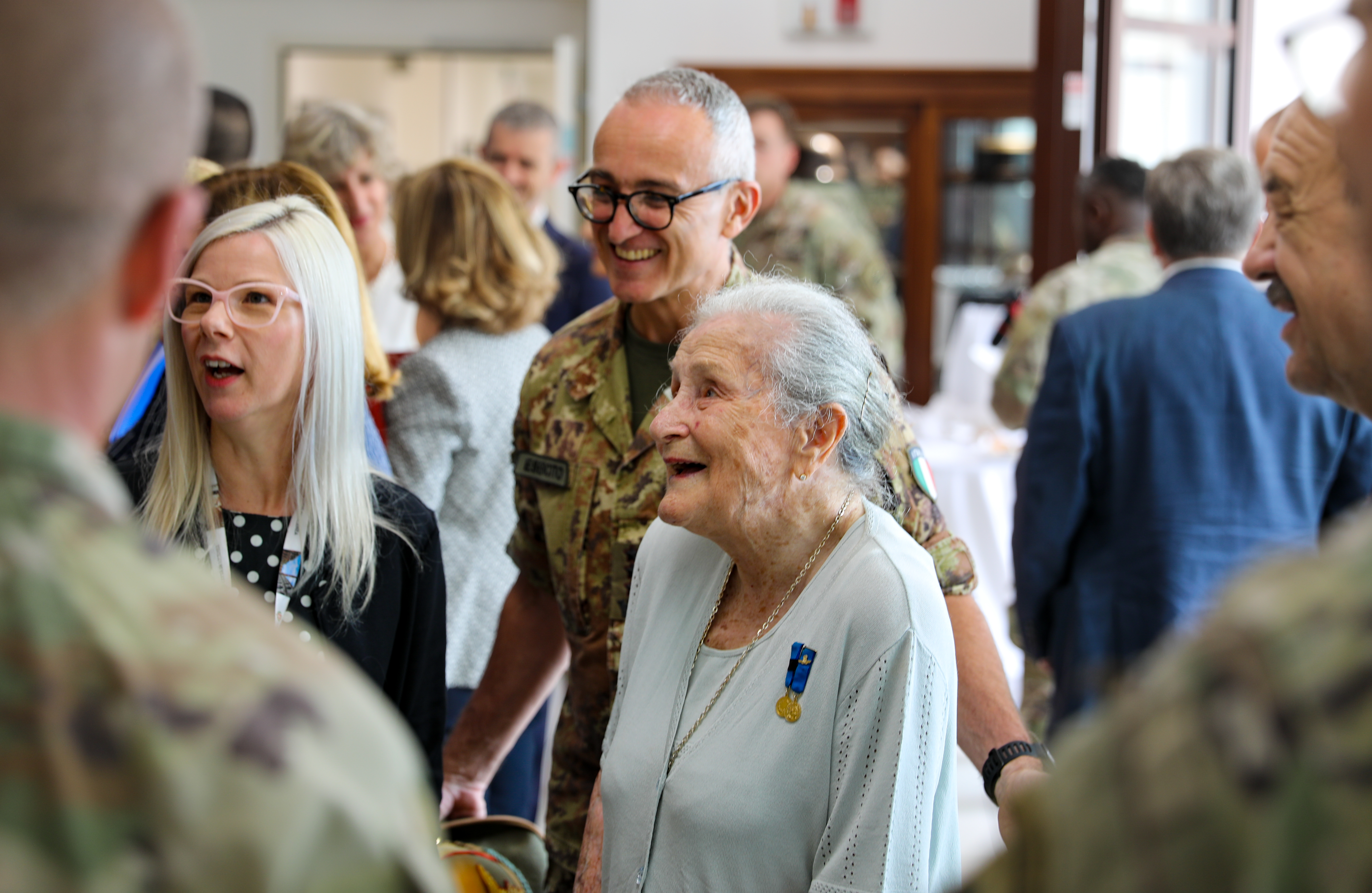 Guest of honor, Ms. Paola Del Din, center, speaks with members of the Vicenza military community in the SETAF-AF headquarters. U.S. Army Southern European Task Force, Africa (SETAF-AF) and the 173rd Airborne Brigade, as well as local Vicenza civilian, military and police leaders during an obersvance of Caserma Del Din's 10th anniversary on Jun. 30, 2023. The base is named of her brother Renato Del Din. SETAF-AF provides U.S. Africa Command and U.S. Army Europe & Africa a dedicated headquarters to synchronize Army activities in Africa and scalable crisis response options in Africa and Europe. (U.S. Army photo by Staff Sgt. Luke Wilson)