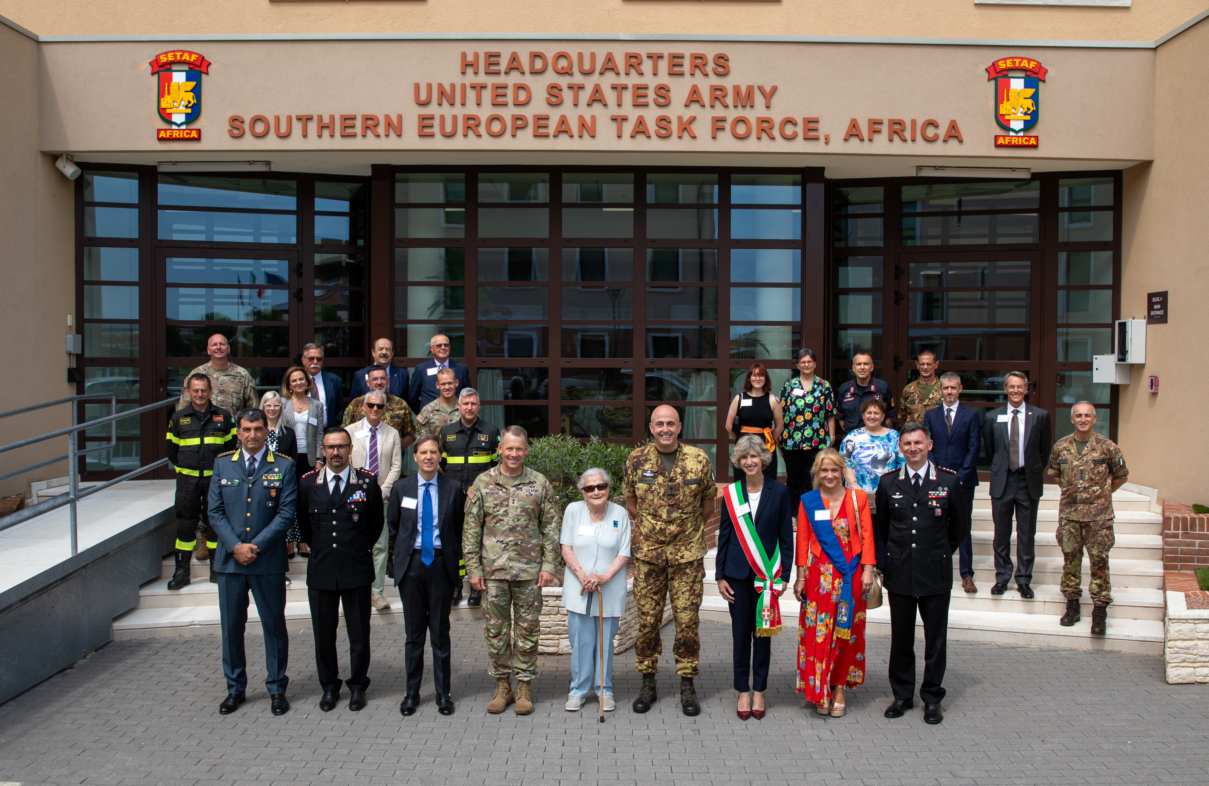 Members of the Vicenza military community, to include U.S. Army Southern European Task Force, Africa (SETAF-AF) and the 173rd Airborne Brigade, as well as local Vicenza civilian, military and police leaders met at SETAF-AF headquarters to conduct obersvance of Caserma Del Din's 10th anniversary on Jun. 30, 2023. SETAF-AF provides U.S. Africa Command and U.S. Army Europe & Africa a dedicated headquarters to synchronize Army activities in Africa and scalable crisis response options in Africa and Europe. (U.S. Army photo by Staff Sgt. Luke Wilson)