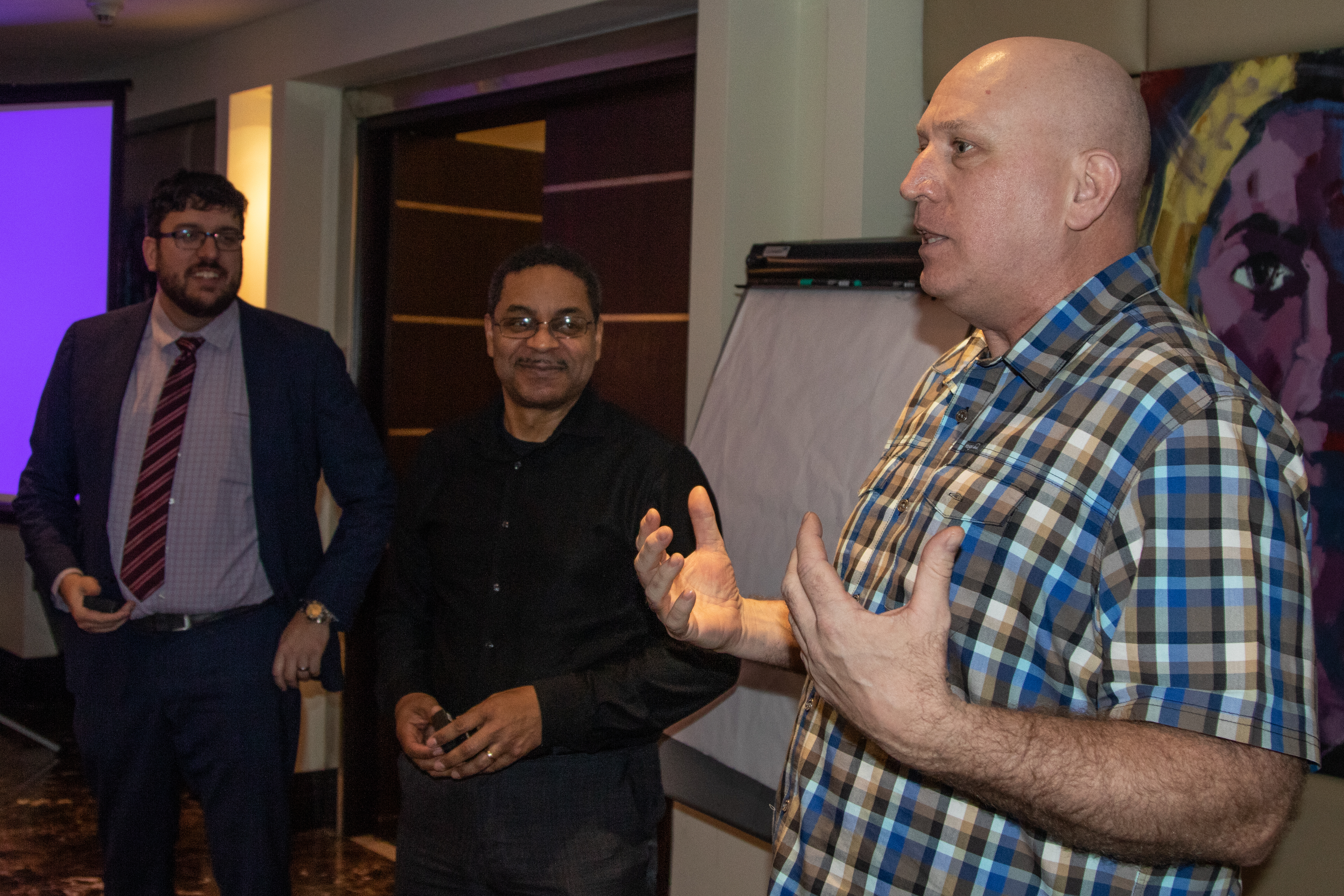 U.S. Army Maj. Tristan Boddicker, operations officer, 645th Regional Support Group, 103rd Sustainment Command (Expeditionary), based in Southfield, Mich., honors Forrest McKinley and Wes Castleberg, exercise planners from U.S. Army Southern European Task Force, Africa (SETAF-AF) and U.S. Africa Command, respectively, during the final planning event for Justified Accord 24 in Nairobi, Kenya, Jan. 22, 2024. JA24 is U.S. Africa Command's largest exercise in East Africa, running from February 26 - March 7. Led by SETAF-AF, and hosted in Kenya, Djibouti and Rwanda, this year's exercise will incorporate personnel and units from 23 nations and five observer countries. This multinational exercise builds readiness for the U.S. joint force, prepares regional partners for UN and AU mandated missions, and increases multinational interoperability in support of humanitarian assistance, disaster response and crisis response. (U.S. Army photo by Maj. Joe Legros)
