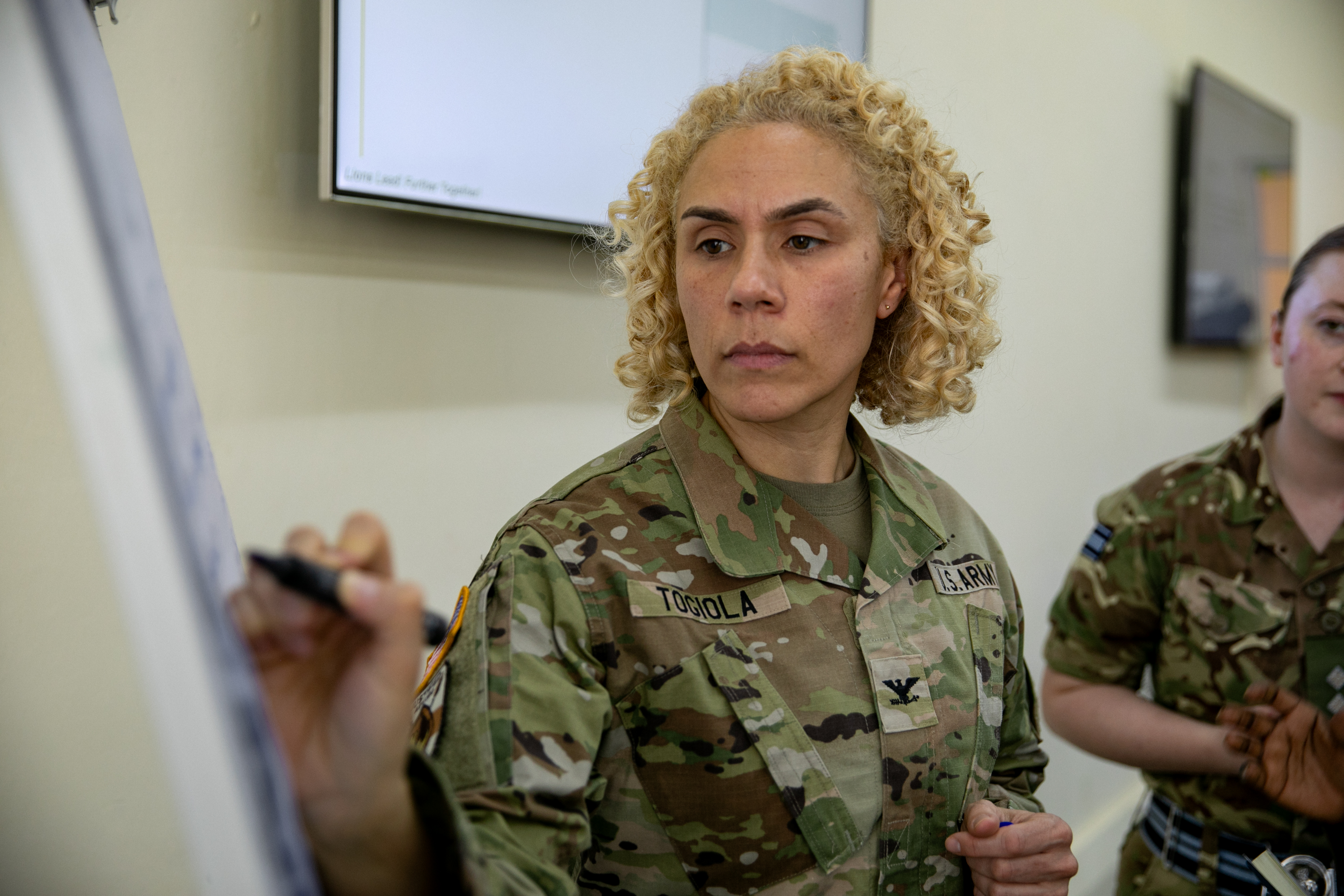 U.S. Army Col. Kelley Togiola, chief of global health engagements, U.S. Army Southern European Task Force, Africa (SETAF-AF), writes on an easel alongside other Soldiers during a group exercise in the Women, Peace and Security class at Justified Accord 2024. JA24 is U.S. Africa Command's largest exercise in East Africa, running from February 26 - March 7. Led by SETAF-AF, and hosted in Kenya, this year's exercise will incorporate personnel and units from 23 nations. This multinational exercise builds readiness for the U.S. joint force, prepares regional partners for UN and AU mandated missions, and increases multinational interoperability in support of humanitarian assistance, disaster response and crisis response. (U.S. Army photo by 1st Lt. Katherine Sibilla)