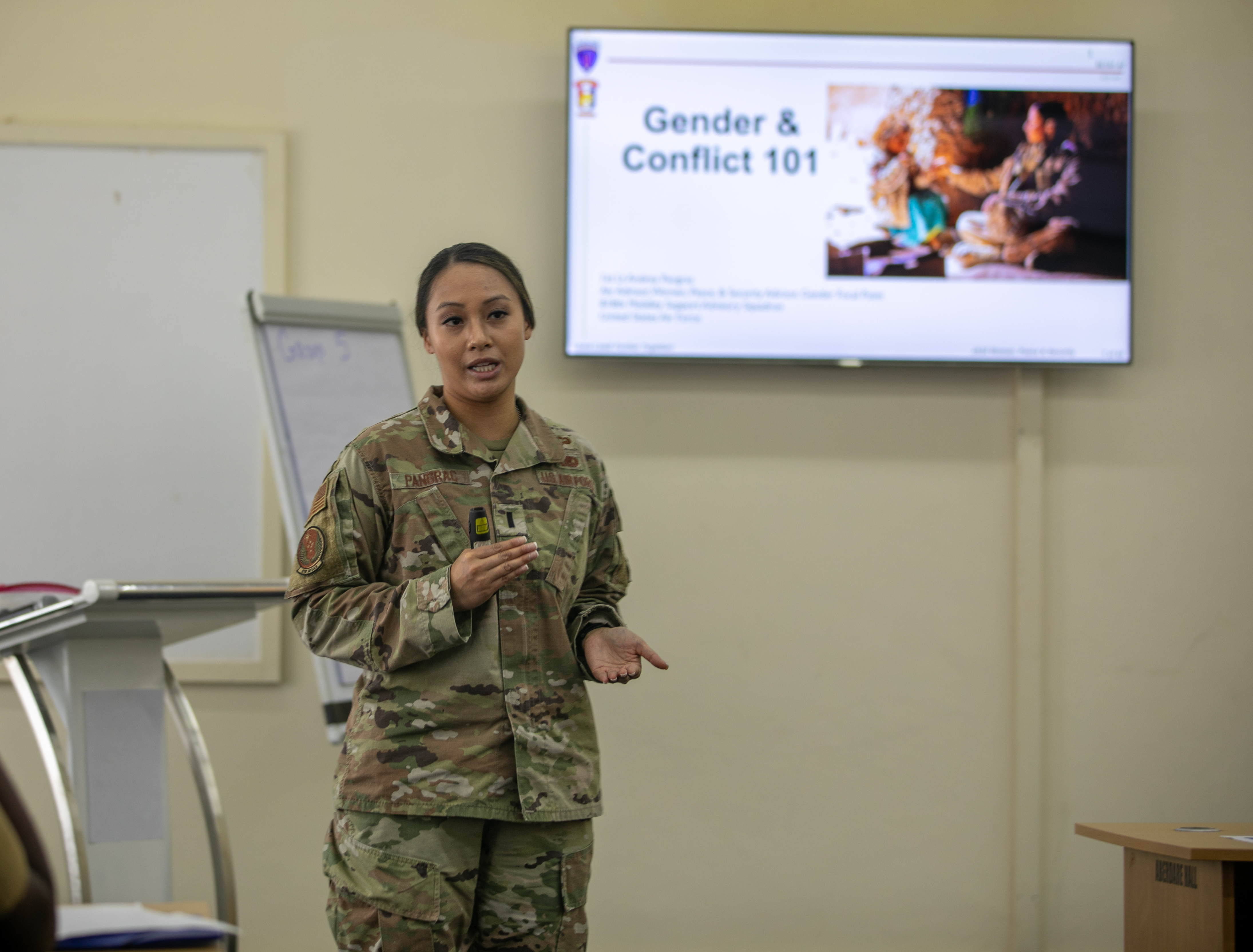 U.S. Air Force 1st Lt. Andrea Pangrac, a WPS instructor and logistics air advisor with the 818th Mobility Support Advisory Squadron, 621st Air Mobility Advisory Group, gives a lecture on Women, Peace and Security during Justified Accord 2024. JA24 is U.S. Africa Command's largest exercise in East Africa, running from February 26 - March 7. Led by SETAF-AF, and hosted in Kenya, this year's exercise will incorporate personnel and units from 23 nations. This multinational exercise builds readiness for the U.S. joint force, prepares regional partners for UN and AU mandated missions, and increases multinational interoperability in support of humanitarian assistance, disaster response and crisis response. (U.S. Army photo by 1st Lt. Katherine Sibilla)