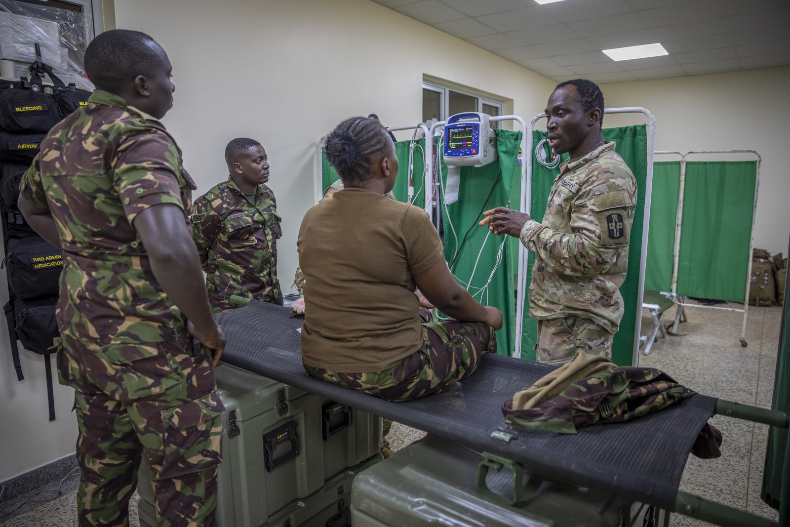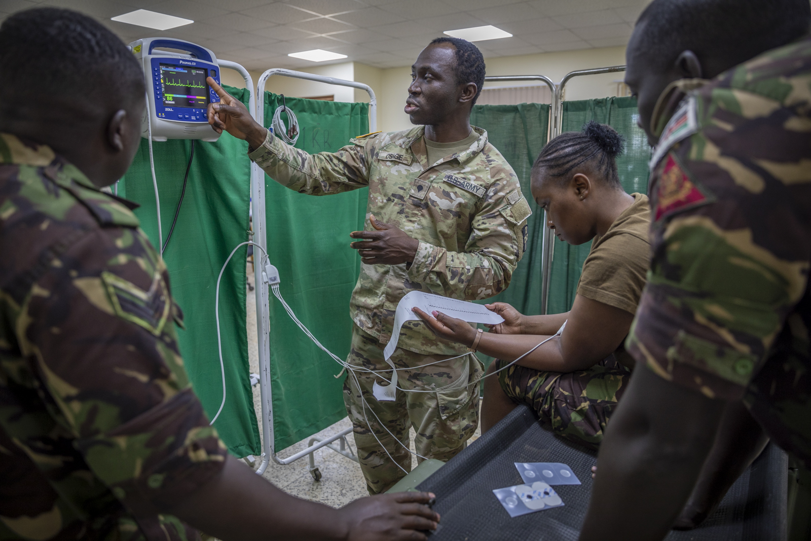 U.S. Army Reserve Spc. Israel Osagie, 425th Medical Detachment,176th Medical Brigade, 807th Medical Command, practical nursing specialist, demonstrate the electrocardiogram machine with the doctors and nurses of the Kenyan Defence Forces in Nanyuki, Kenya on Feb, 29, 2024. Justified Accord 2024 (JA24) is U.S. Africa Command's largest exercise in East Africa, running from Feb. 26 - March 7. Led by U.S. Army Southern European Task Force, Africa (SETAF-AF), and hosted in Kenya, this year's exercise will incorporate personnel and units from 23 nations. This multinational exercise builds readiness for the U.S. joint force, prepares regional partners for UN and AU mandated missions, and increases multinational interoperability in support of humanitarian assistance, disaster response and crisis response. (U.S. Army Reserve photo by Spc. Ronald D. Bell)