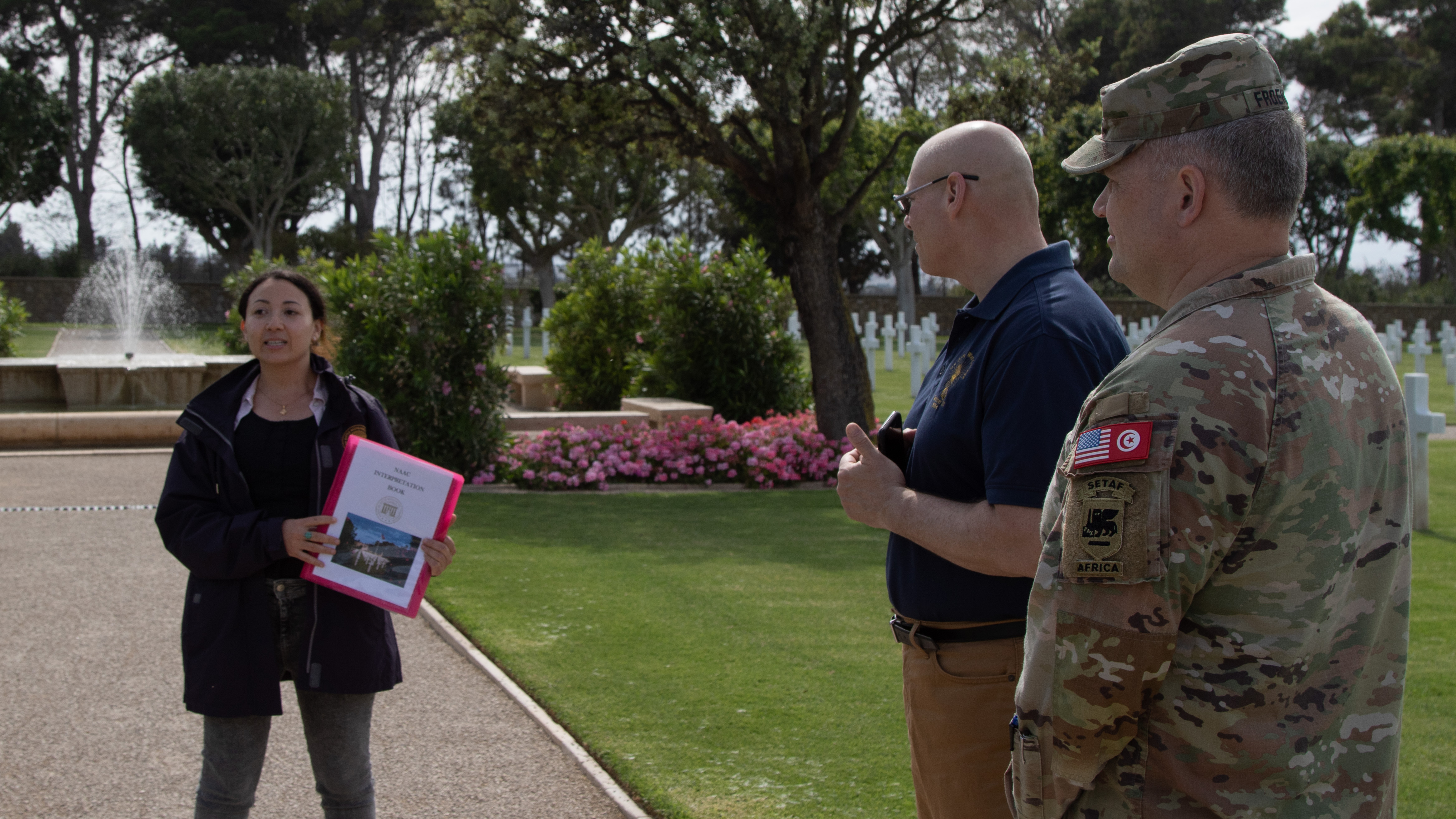 U.S. Army Brig. Gen. John LeBlanc (right) and Col. Chad Froehlich (left), the deputy commanding general and chief of staff, respectively, of U.S. Army Southern European Task Force, Africa (SETAF-AF), visit the North Africa American Cemetery and Memorial in Carthage, Tunisia on May 7, 2024. A tour guide shares the history of the site, the final resting place for over 2,800 U.S. service members. African Lion 2024 marks the 20th anniversary of U.S. Africa Command’s premier joint exercise led by SETAF-AF, running from April 19 to May 31 across Ghana, Morocco, Senegal, and Tunisia, with over 8,100 participants from 27 nations and NATO contingents. (U.S. Army photo by Maj. Joe Legros)