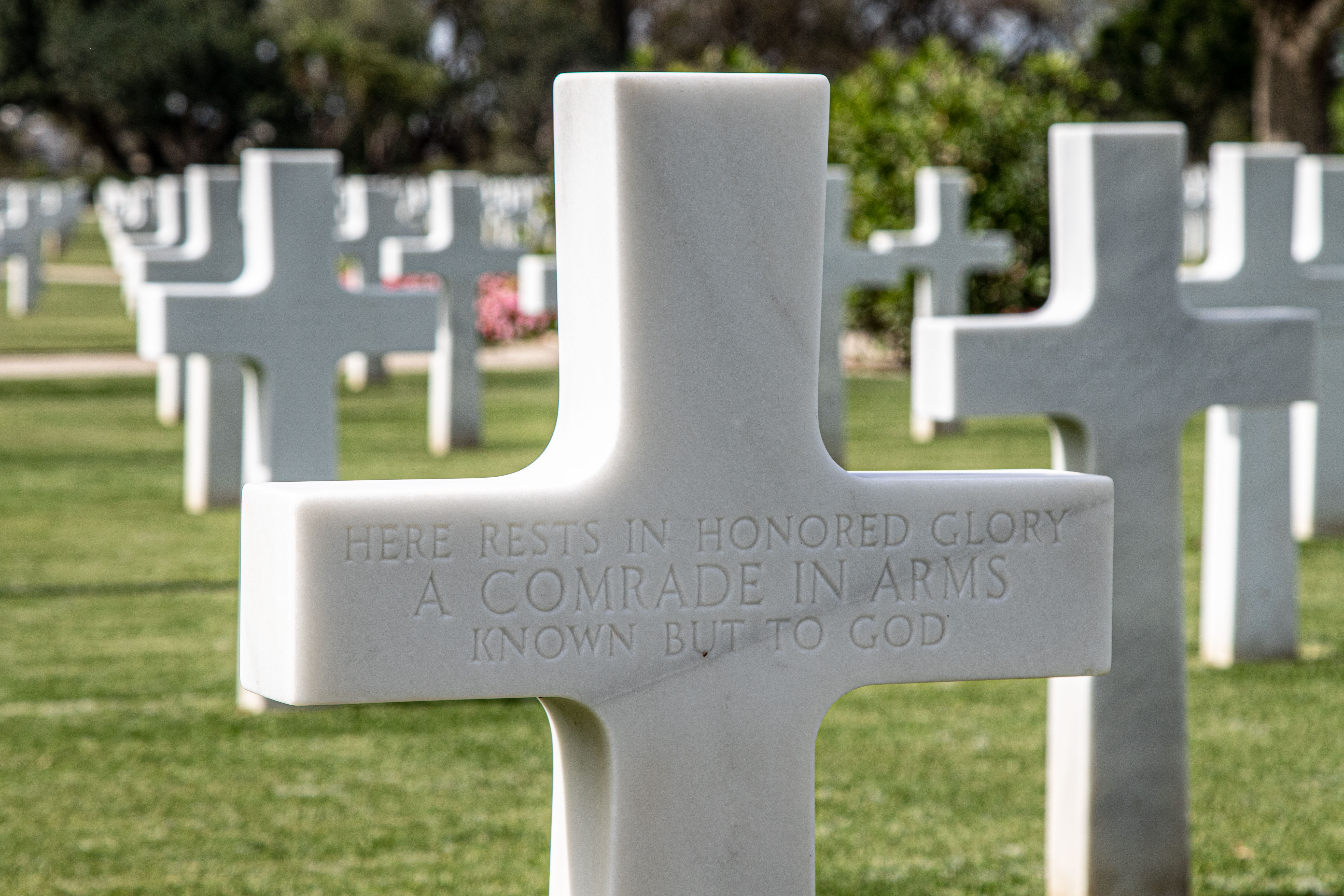 The tombstone for an unnamed U.S. Soldier at the North Africa American Cemetery and Memorial reads, “Here rests in honored glory a comrade in arms known only to God,” in Carthage, Tunisia, May 8, 2024. The cemetery is the final resting place for over 2,800 U.S. service members. African Lion 2024 marks the 20th anniversary of U.S. Africa Command’s premier joint exercise led by U.S. Army Southern European Task Force, Africa (SETAF-AF), running from April 19 to May 31 across Ghana, Morocco, Senegal, and Tunisia, with over 8,100 participants from 27 nations and NATO contingents. (U.S. Army photo by Maj. Joe Legros)