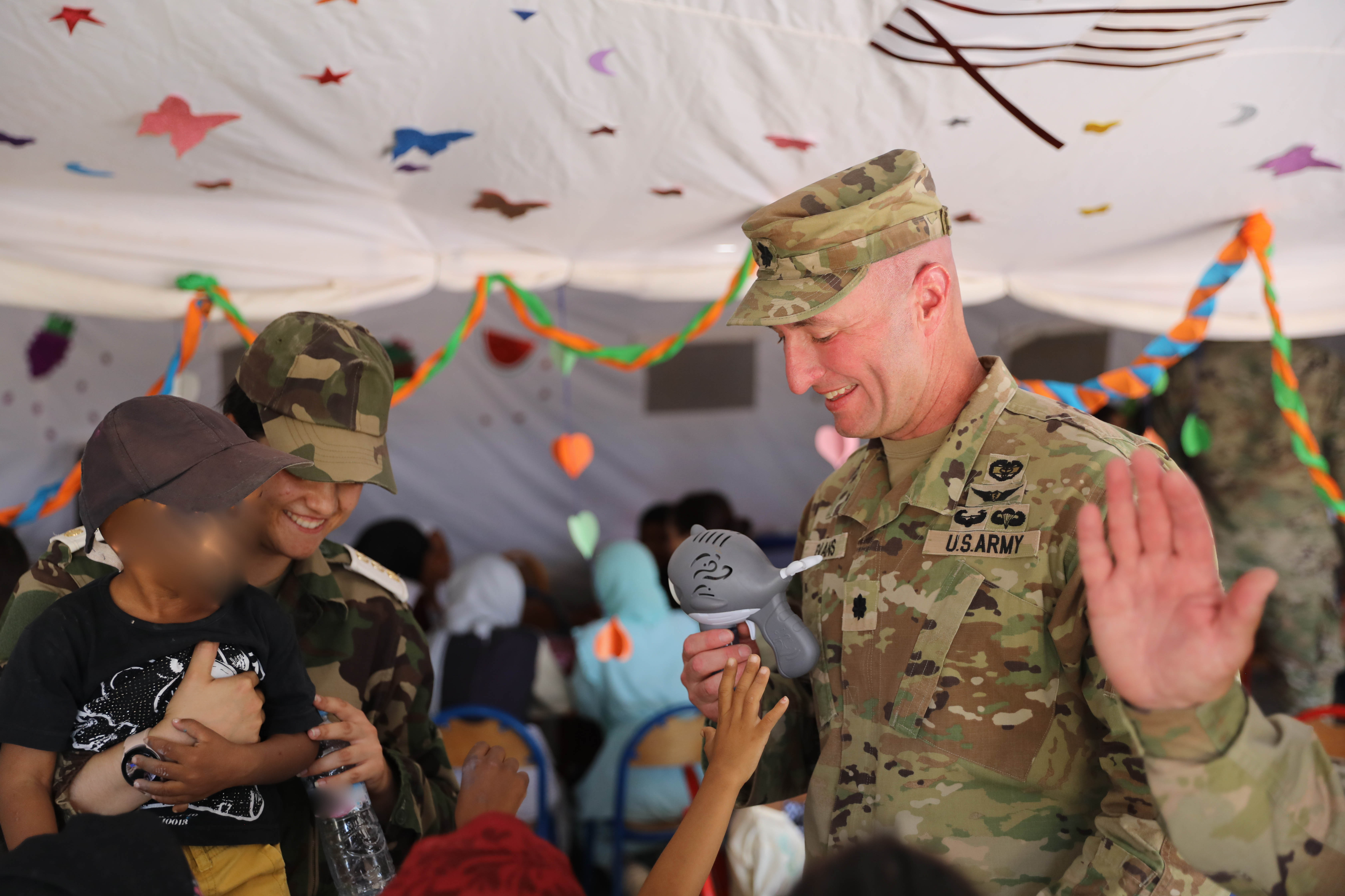U.S. Army Lt. Col. Mark Evans, State Headquarters Medical Readiness Detachment (MRD), Utah Army National Guard (UTARNG), entertains children at a field hospital during African Lion 2024 (AL24) in Akka, Morocco, May 25, 2024. The Utah National Guard has been partners with Morocco through the Department of Defense State Partnership Program for 21 years and led the effort to partner with the Moroccan Royal Armed Forces for a humanitarian civic assistance (HCA) operation during African Lion 2024 (AL24). The HCA event enables U.S. military personnel to work with their Moroccan counterparts to provide medical services to civilian populations who may lack access to medical care, while improving the operational readiness of participating service members. AL24 marks the 20th anniversary of U.S. Africa Command’s premier joint exercise led by U.S. Army Southern European Task Force, Africa (SETAF-AF), running from April 19 to May 31 across Ghana, Morocco, Senegal and Tunisia, with over 8,100 participants from 27 nations and NATO contingents. (U.S. Army photo by Spc. Trenton Pallone) (This photo has been altered to blur the identity of the children in the photo.)
