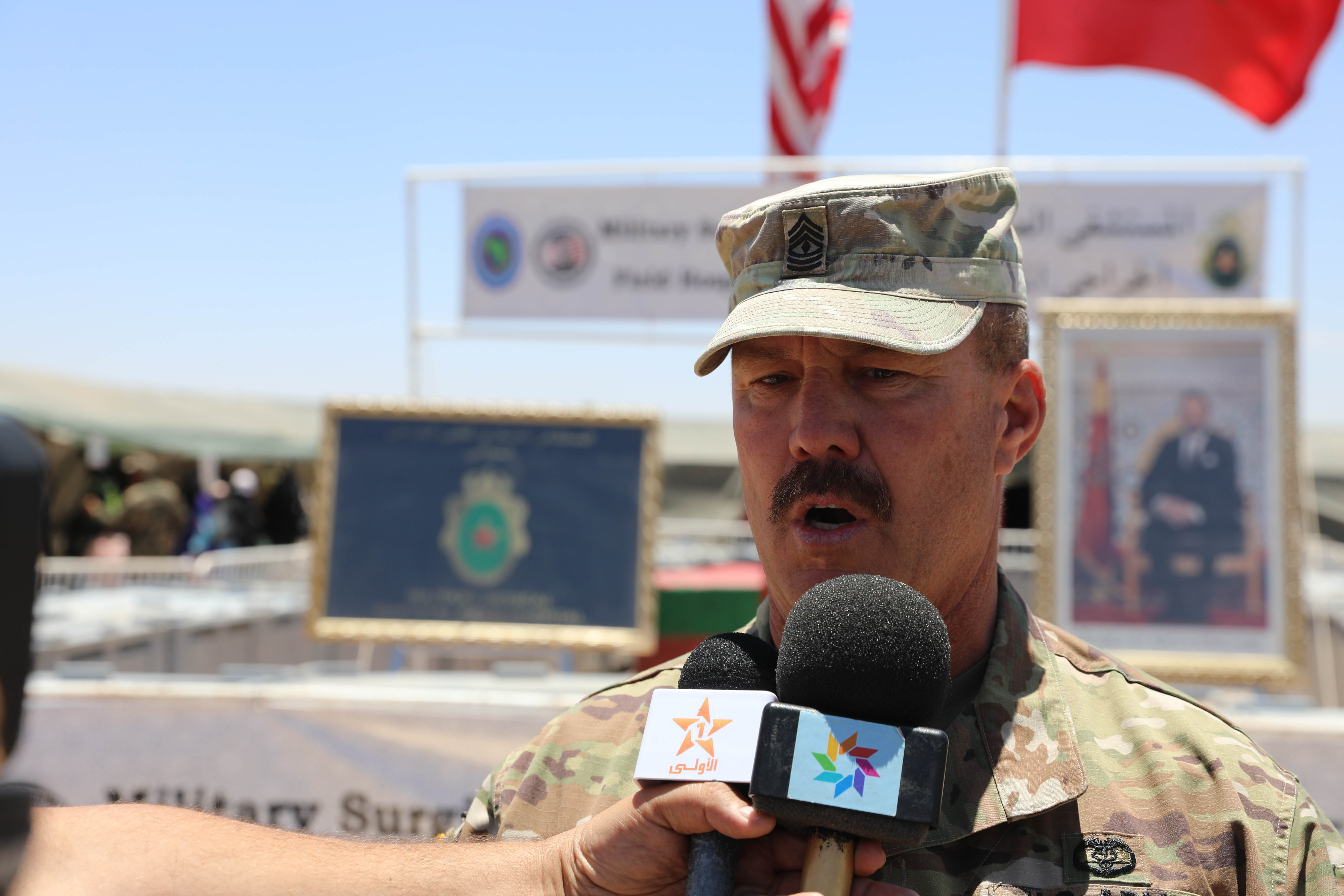 U.S. Army 1st. Sgt. Robert Stephens, assigned to the State Headquarters Medical Readiness Detachment (MRD), Utah National Guard, speaks to the Moroccan press about the detachment’s role during African Lion 2024 (AL24) in Akka, Morocco, May 25, 2024. The Utah National Guard has been partners with Morocco through the Department of Defense State Partnership Program for 21 years and led the effort to partner with the Moroccan Royal Armed Forces for a humanitarian civic assistance (HCA) operation during African Lion 2024 (AL24). The HCA event enables U.S. military personnel to work with their Moroccan counterparts to provide medical services to civilian populations who may lack access to medical care, while improving the operational readiness of participating service members. AL24 marks the 20th anniversary of U.S. Africa Command’s premier joint exercise led by U.S. Army Southern European Task Force, Africa (SETAF-AF), running from April 19 to May 31 across Ghana, Morocco, Senegal and Tunisia, with over 8,100 participants from 27 nations and NATO contingents. (U.S. Army photo by Spc. Trenton Pallone)