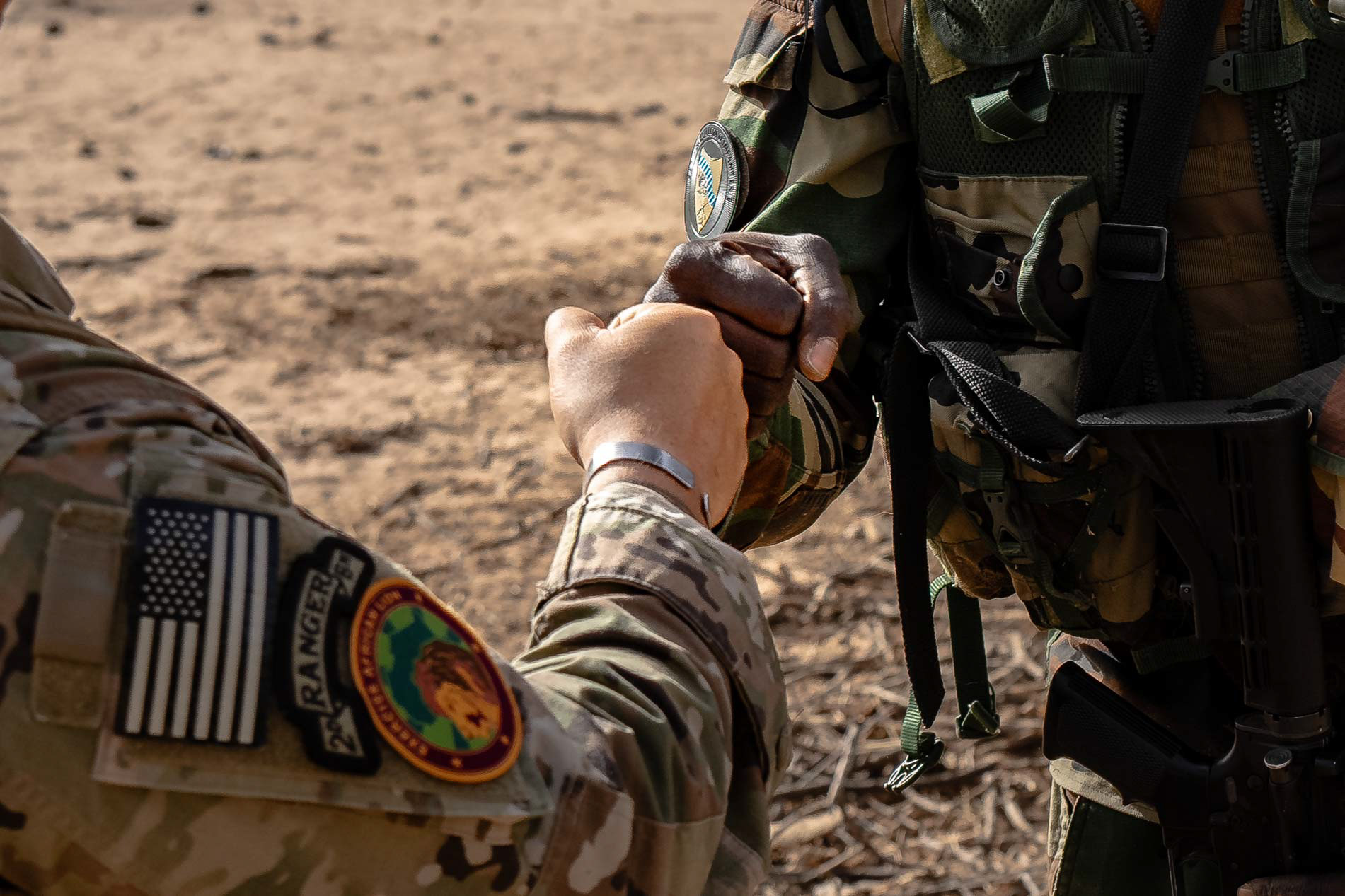 A 1st Battalion, 175th Infantry Regiment, Maryland National Guard Soldier fist bumps with a Senegalese soldier during a dry-fire situational training exercise (STX) lane led by U.S. and the Netherlands Armed Forces, a NATO ally, as part of exercise African Lion 2024 (AL24) in Dodji, Senegal, May 22, 2024. The STX lanes were designed to simulate a search and attack before initial contact is made with enemy forces to enhance lethality and combat readiness. AL24 marks the 20th anniversary of U.S. Africa Command’s premier joint exercise led by U.S. Army Southern European Task Force, Africa (SETAF-AF), running from April 19 to May 31 across Ghana, Morocco, Senegal, and Tunisia, with over 8,100 participants from 27 nations and NATO contingents. (U.S. Army Reserve photo by Sgt. 1st Class Nicholas J. De La Pena)