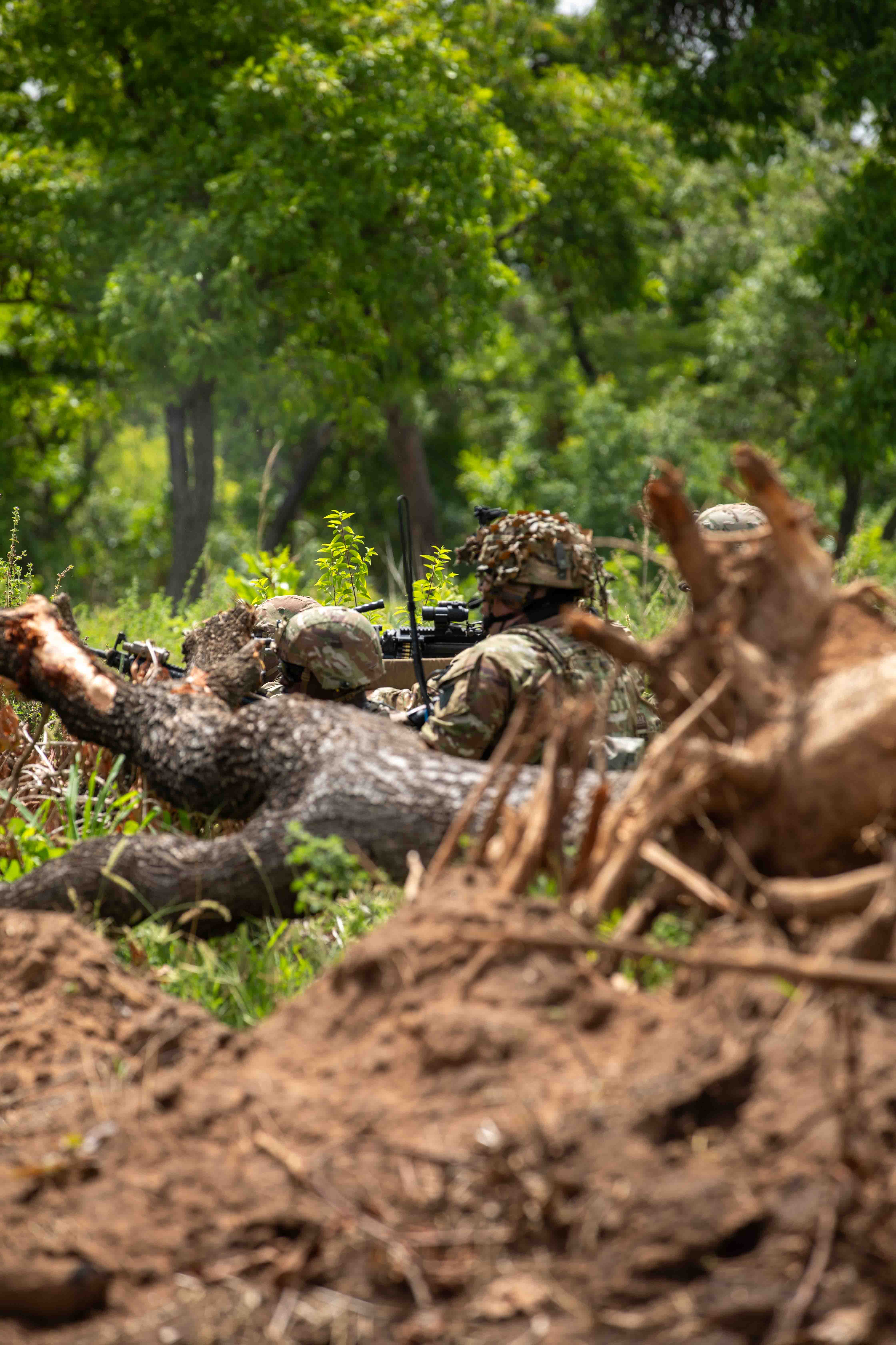 U.S. Army Soldiers assigned to 1st Battalion, 175th Infantry Regiment, Maryland Army National Guard, set up a support by fire position while conducting a react to contact drill during exercise African Lion 2024 (AL24), Tamale Air Force Base, Ghana, May 18, 2024. 2024 marks the 20th anniversary of U.S. Africa Command’s premier joint exercise led by U.S. Army Southern European Task Force, Africa (SETAF-AF), running from April 19 to May 31 across Ghana, Morocco, Senegal and Tunisia, with over 8,100 participants from 27 nations and NATO contingents. (U.S. Army photo by Spc. Cade Castillo)