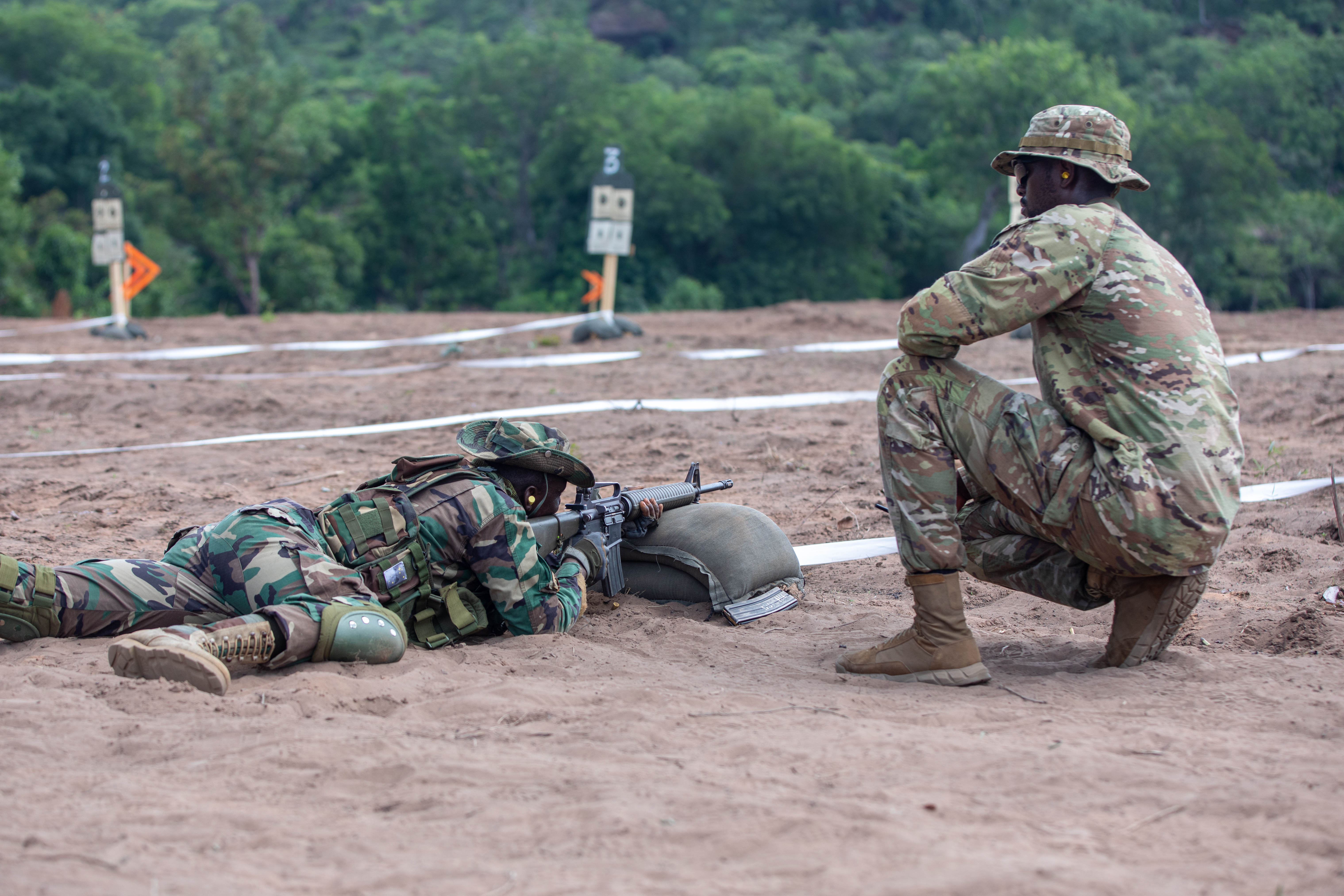 A U.S. Army Soldier assigned to 1st Battalion, 175th Infantry Regiment, Maryland Army National Guard, teaches basic rifle marksmanship to a member of the Ghana Armed Forces for grouping and zeroing on the range in Domongo, Ghana, May 21, 2024. This range day was held during exercise African Lion 2024 (AL24) and showcased multinational partnership and willingness to share best practices with one another. AL24 marks the 20th anniversary of U.S. Africa Command’s premier joint exercise led by U.S. Army Southern European Task Force, Africa (SETAF-AF), running from April 19 to May 31 across Ghana, Morocco, Senegal and Tunisia, with over 8,100 participants from 27 nations and NATO contingents. (U.S. Army Reserve photo by Sgt. Caitlinn Belcher)