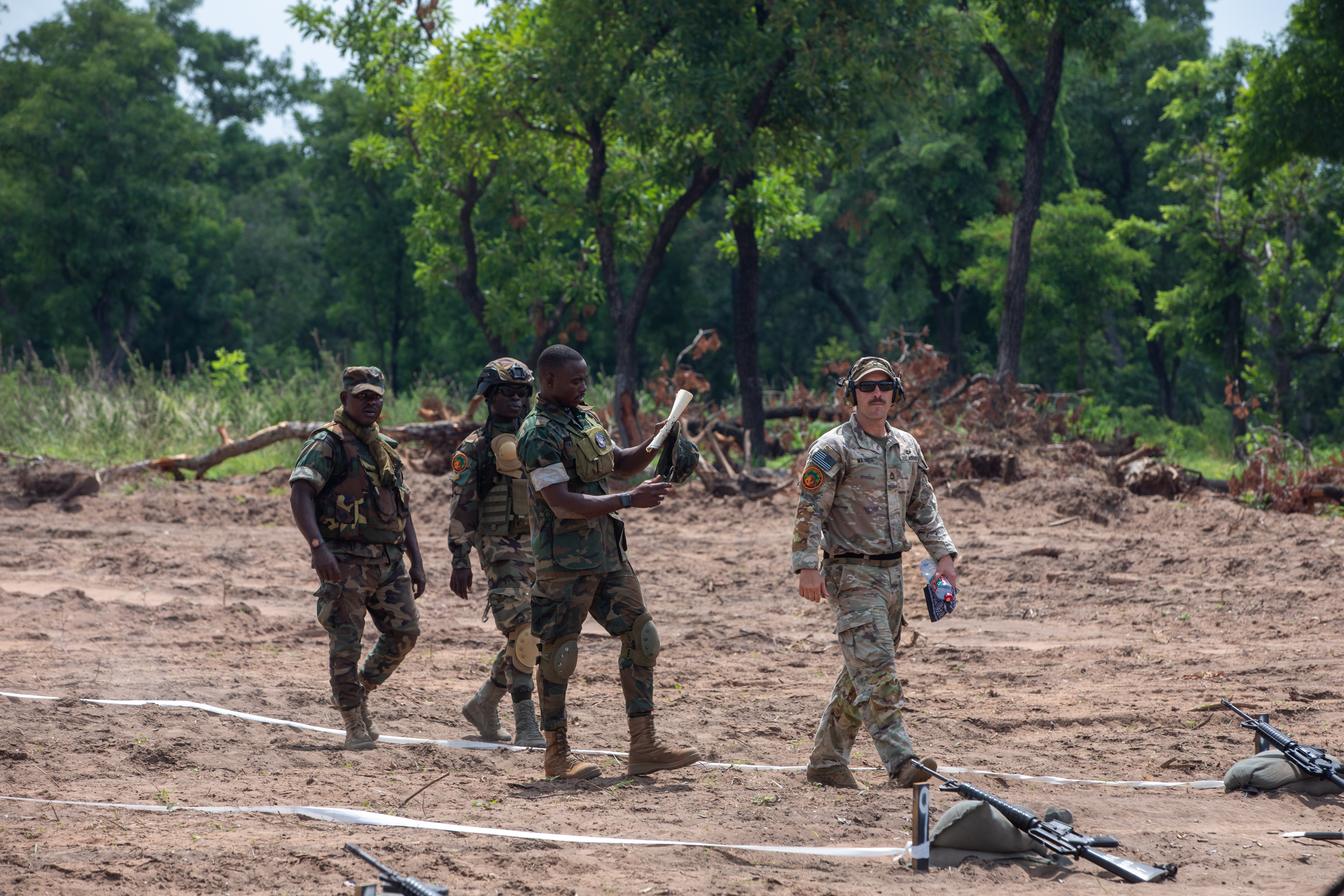A U.S. Army Soldier assigned to 1st Battalion, 175th Infantry Regiment, Maryland Army National Guard, teaches basic rifle marksmanship to members of the Ghana Armed Forces for grouping and zeroing on the range in Domongo, Ghana, May 21, 2024. This range day was held during exercise African Lion 2024 (AL24) and showcased multinational partnership and willingness to share best practices with one another. AL24 marks the 20th anniversary of U.S. Africa Command’s premier joint exercise led by U.S. Army Southern European Task Force, Africa (SETAF-AF), running from April 19 to May 31 across Ghana, Morocco, Senegal and Tunisia, with over 8,100 participants from 27 nations and NATO contingents. (U.S. Army Reserve photo by Sgt. Caitlinn Belcher)
