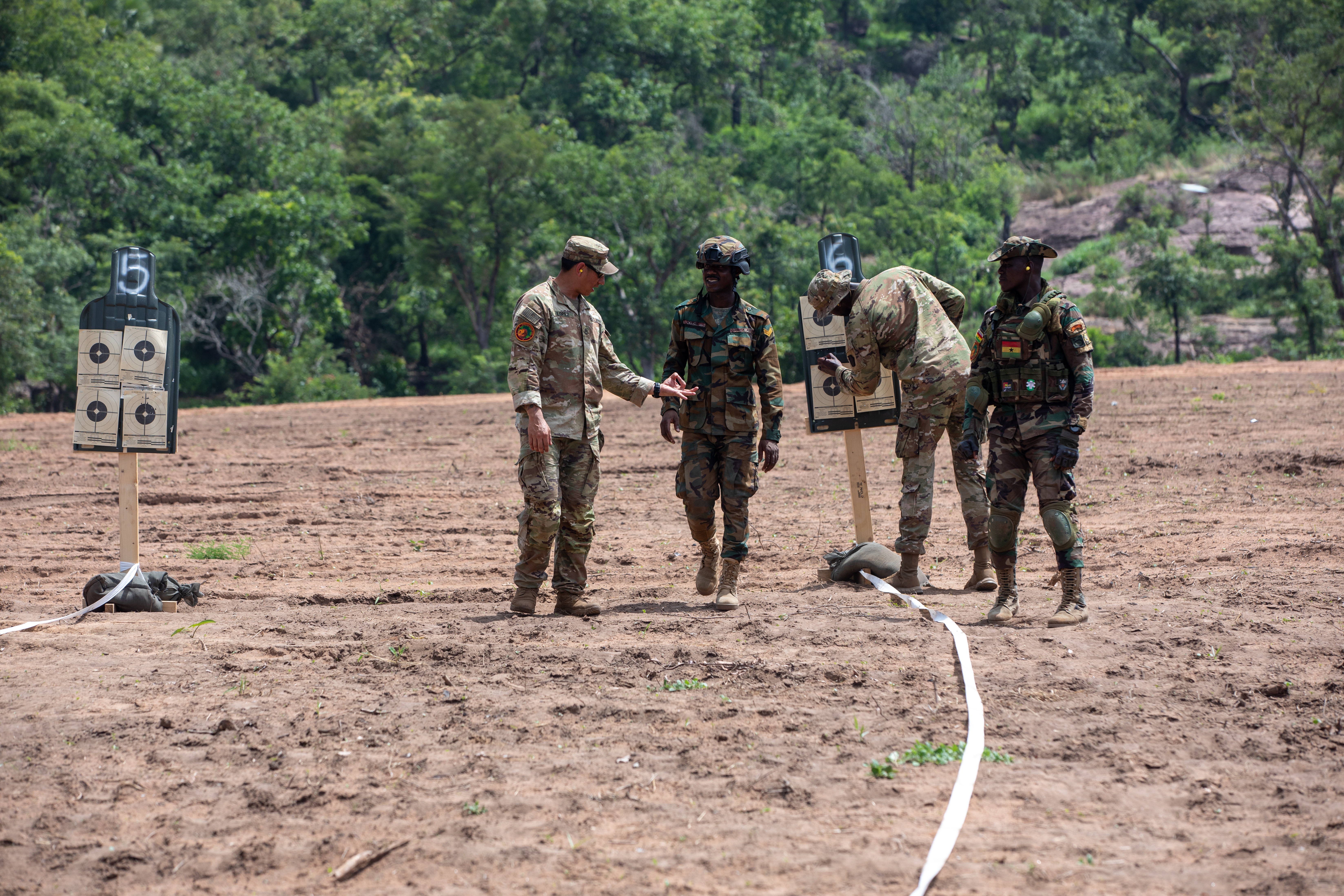 U.S. Army Soldiers assigned to 1st Battalion, 175th Infantry Regiment, Maryland Army National Guard, teach basic rifle marksmanship to the Ghana Armed Forces for grouping and zeroing on the range in Domongo, Ghana, May 21, 2024. This range day was held during exercise African Lion 2024 (AL24) and showcased multinational partnership and willingness to share best practices with one another. AL24 marks the 20th anniversary of U.S. Africa Command’s premier joint exercise led by U.S. Army Southern European Task Force, Africa (SETAF-AF), running from April 19 to May 31 across Ghana, Morocco, Senegal and Tunisia, with over 8,100 participants from 27 nations and NATO contingents. (U.S. Army Reserve photo by Sgt. Caitlinn Belcher)
