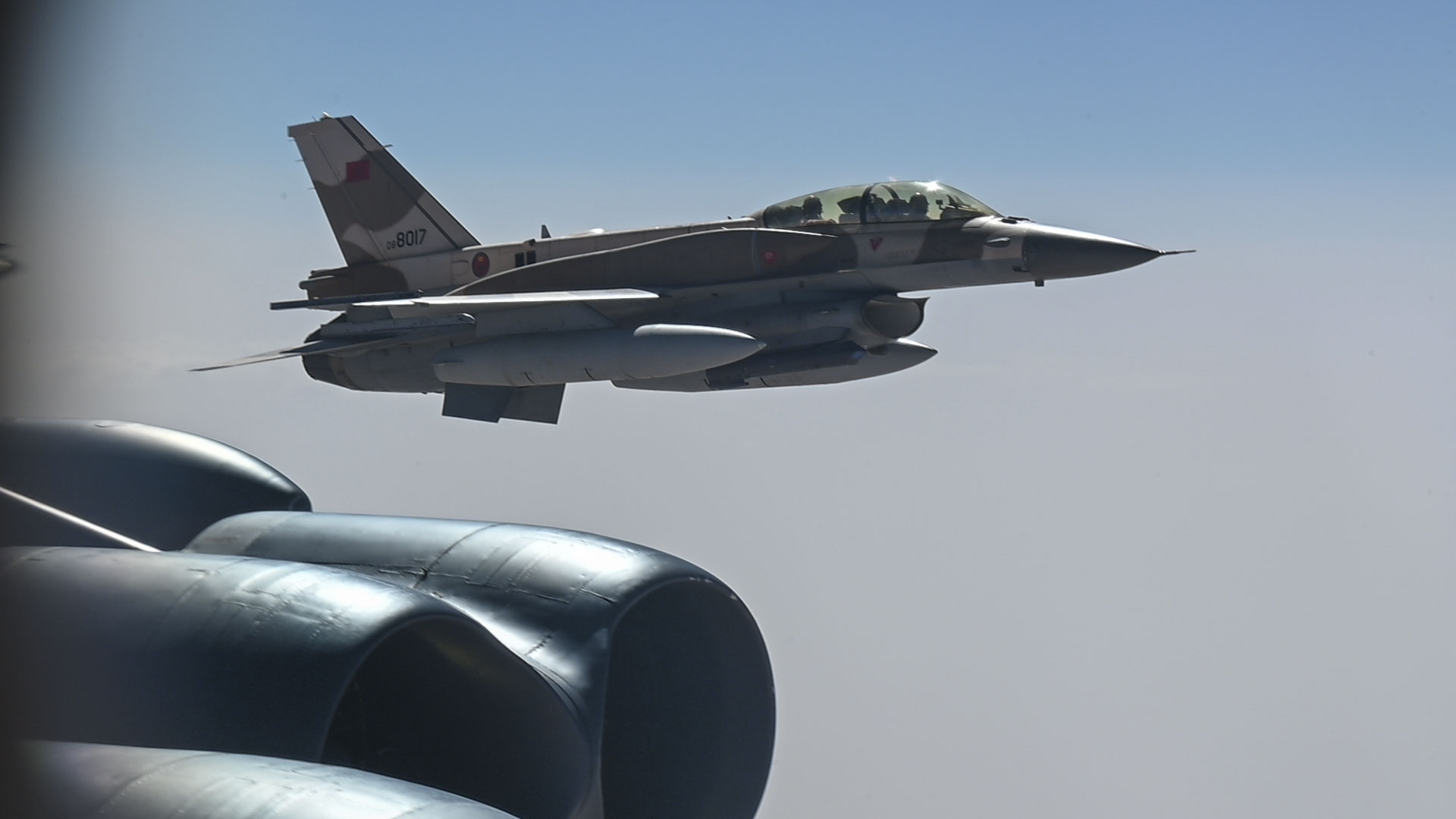 A Moroccan Royal Air Force F-16 Fighting Falcon escorts a U.S. Air Force B-52H Stratofortress, assigned to the 69th Expeditionary Bomb Squadron, Minot Air Force Base, North Dakota, during exercise African Lion 2024 (AL24) over Morocco, May 31, 2024. AL24 marks the 20th anniversary of the U.S. Africa Command’s premier joint exercise led by U.S. Army Southern European Task Force, Africa (SETAF-AF), running from April 19 to May 31 across Ghana, Morocco, Senegal and Tunisia, with over 8,100 participants from 27 nations and NATO contingents. (U.S. Air Force photo by Staff Sgt. Emily Farnsworth)