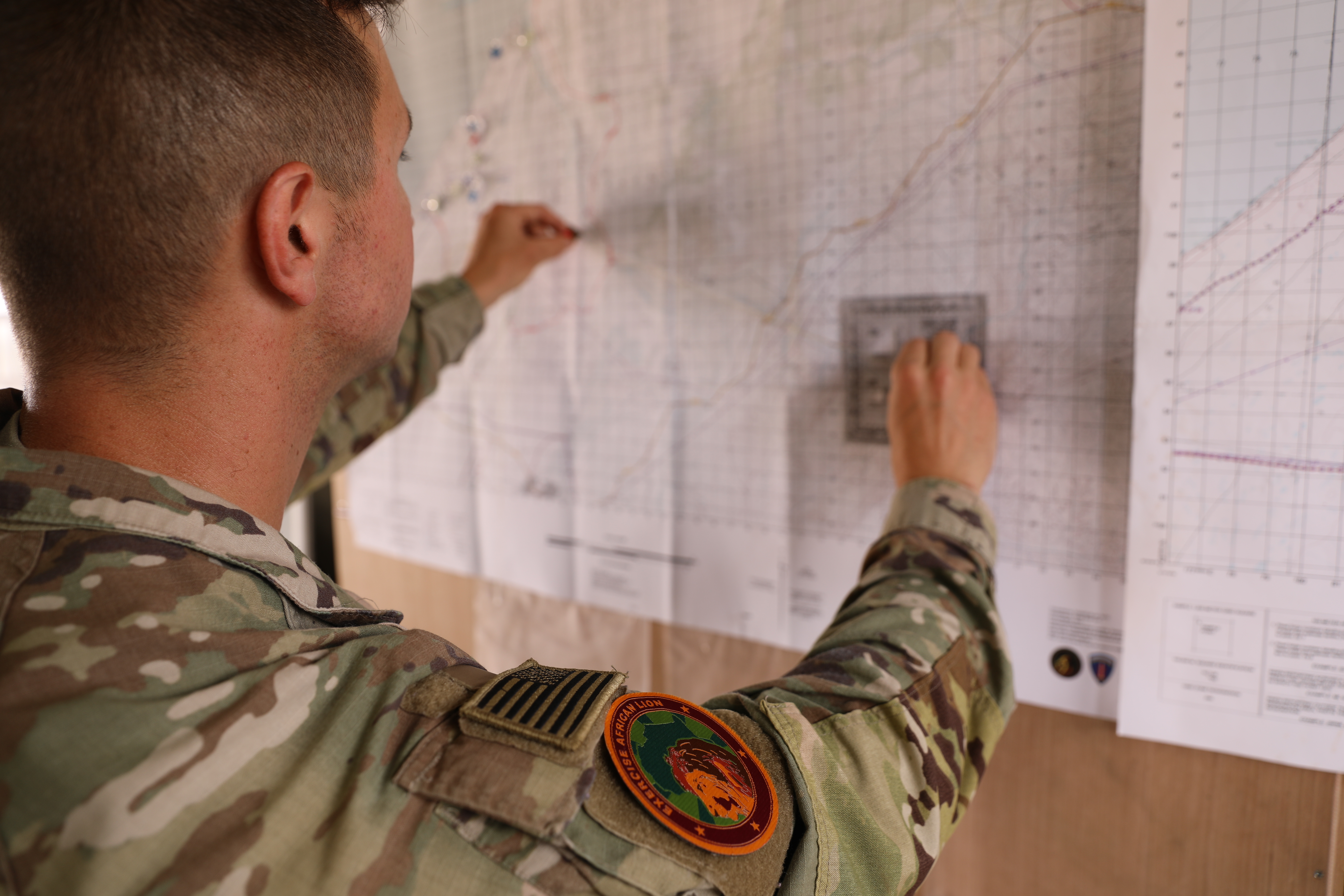 U.S. Army Capt. Joseph Brown, an engineer officer assigned to Headquarters and Headquarters Company, 27th Infantry Brigade Combat Team, New York Army National Guard, plots distances on a map inside the brigade’s command post during exercise African Lion in Tantan, Morocco, May 29, 2024. African Lion 2024 marks the 20th anniversary of U.S. Africa Command’s premier joint exercise led by U.S. Army Southern European Task Force, Africa (SETAF-AF), running from April 19 to May 31 across Ghana, Morocco, Senegal, and Tunisia, with over 9,100 participants from 27 nations and NATO contingents. (U.S. Army photo by Avery Schneider)