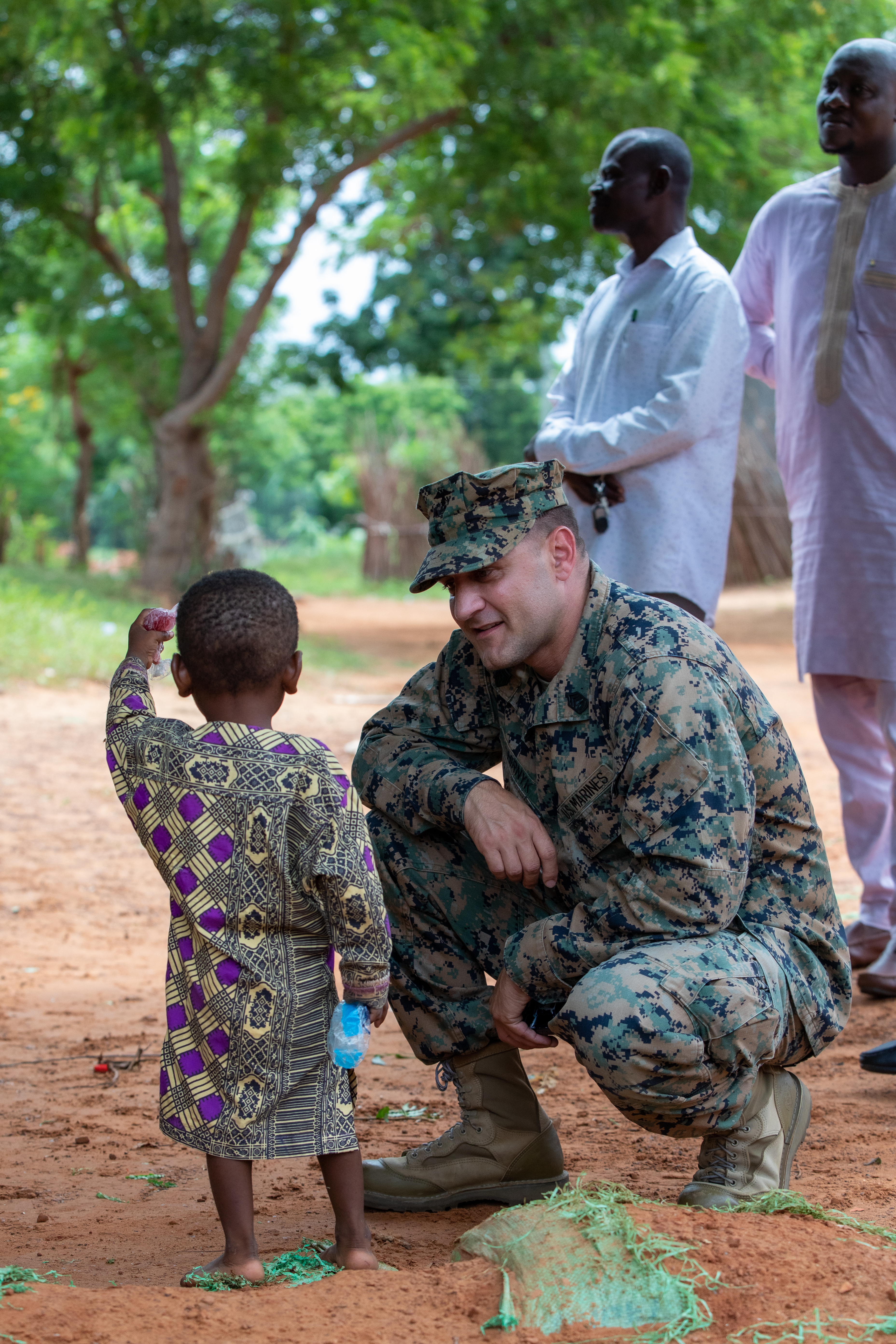 U.S. Marine Corps Gunnery Sgt. John Hirnyk, civil affairs team chief, 4th Civil Affairs Group, Force Headquarters Group, U.S. Marine Corps Forces Reserve, interacts with a child at a medical civic action program (MEDCAP) event held during African Lion 2024 (AL24) in Damongo, Ghana, May 17, 2024. AL24 marks the 20th anniversary of U.S. Africa Command’s premier joint exercise led by U.S. Army Southern European Task Force, Africa (SETAF-AF), running from April 19 to May 31 across Ghana, Morocco, Senegal and Tunisia, with over 8,100 participants from 27 nations and NATO contingents. (U.S. Army Reserve photo by Sgt. Caitlinn Belcher)