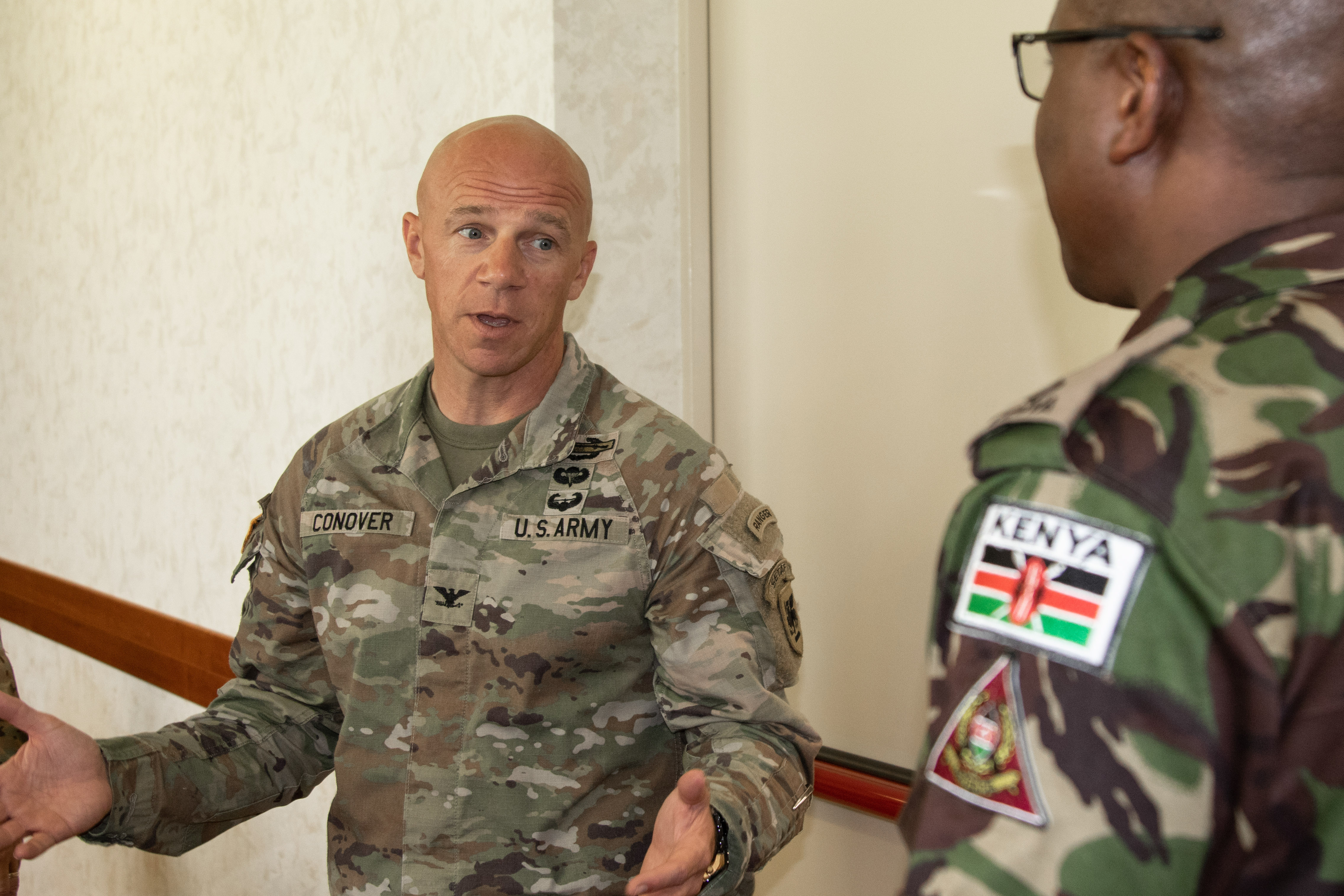 U.S. Army Col. Drew Conover, director of exercises (G7), U.S. Army Southern European Task Force, Africa (SETAF-AF), speaks with a Kenya Defence Forces counterpart during the initial planning event for exercise Justified Accord 2025 (JA25) in Vicenza, Italy, Jun. 13, 2024. JA25 is U.S. Africa Command's largest exercise in East Africa, running from Feb. 10-21, 2025. Led by SETAF-AF, and hosted in Kenya, this year's exercise incorporates personnel and units from over 20 nations. JA25 builds readiness for the U.S. joint force, prepares regional partners for UN and AU mandated missions, and increases multinational interoperability in support of humanitarian assistance, disaster response and crisis response. (U.S. Army photo by Maj. Joe Legros)