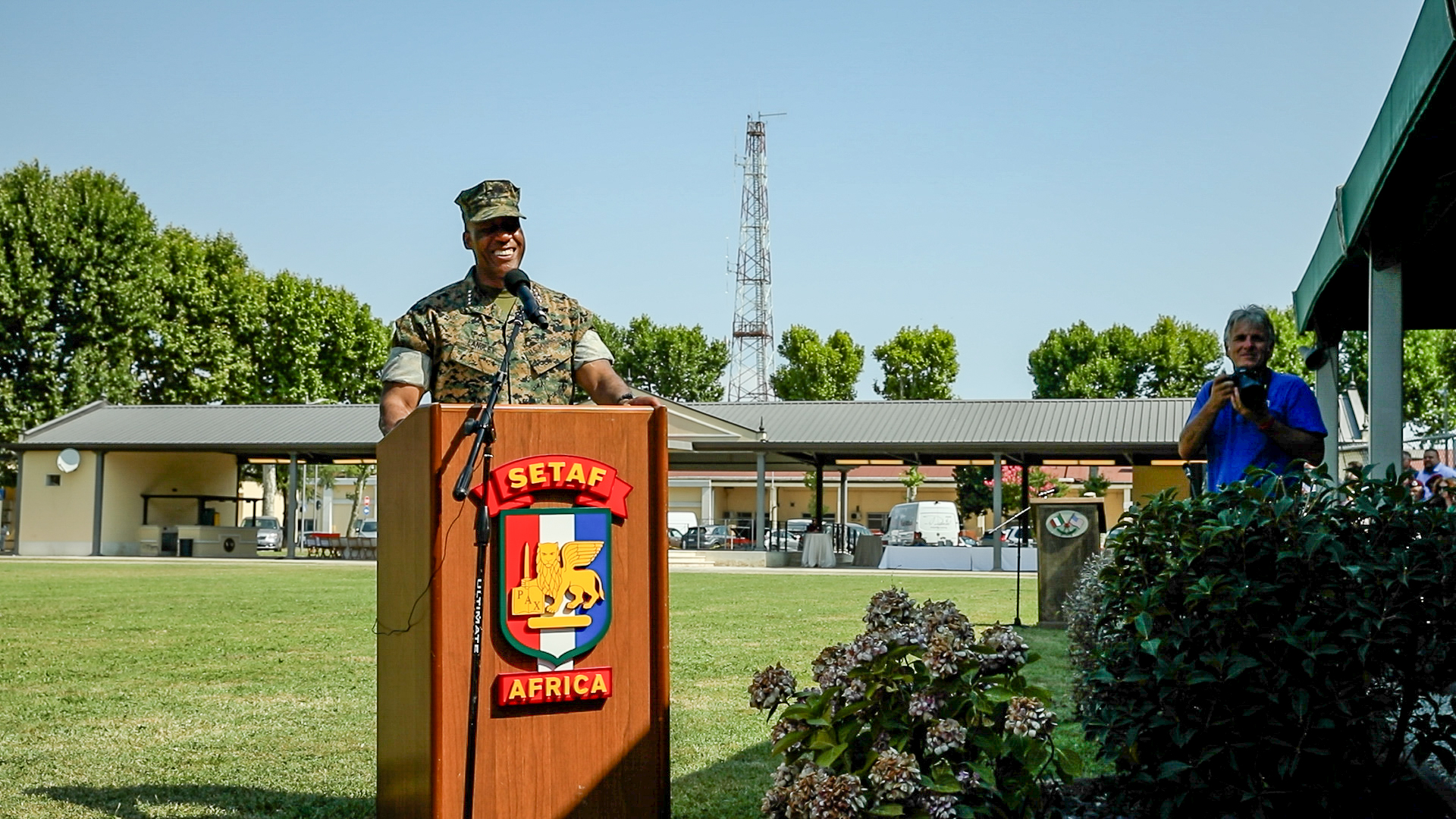 U.S. Marine Corps Gen. Michael E. Langley, commander, U.S. Africa Command, speaks to the crowd during a change of command ceremony for U.S. Army Southern European Task Force, Africa (SETAF-AF), at Caserma Ederle, Vicenza, Italy, July 18, 2024. U.S. Army Maj. Gen. Andrew C. Gainey replaces U.S. Army Maj. Gen. Todd R. Wasmund as the new incoming commanding general of SETAF-AF. The change of command ceremony is a military tradition that represents a transfer of authority and responsibility for a unit or command. SETAF-AF provides U.S. Africa Command and U.S. Army Europe and Africa a dedicated headquarters to synchronize Army activities in Africa and scalable crisis response options in Africa and Europe (U.S. Army photo by Spc. Christopher Sanchez)