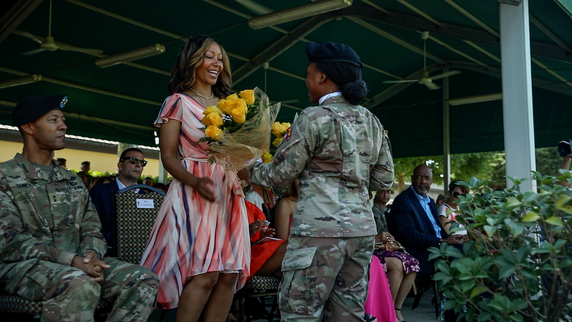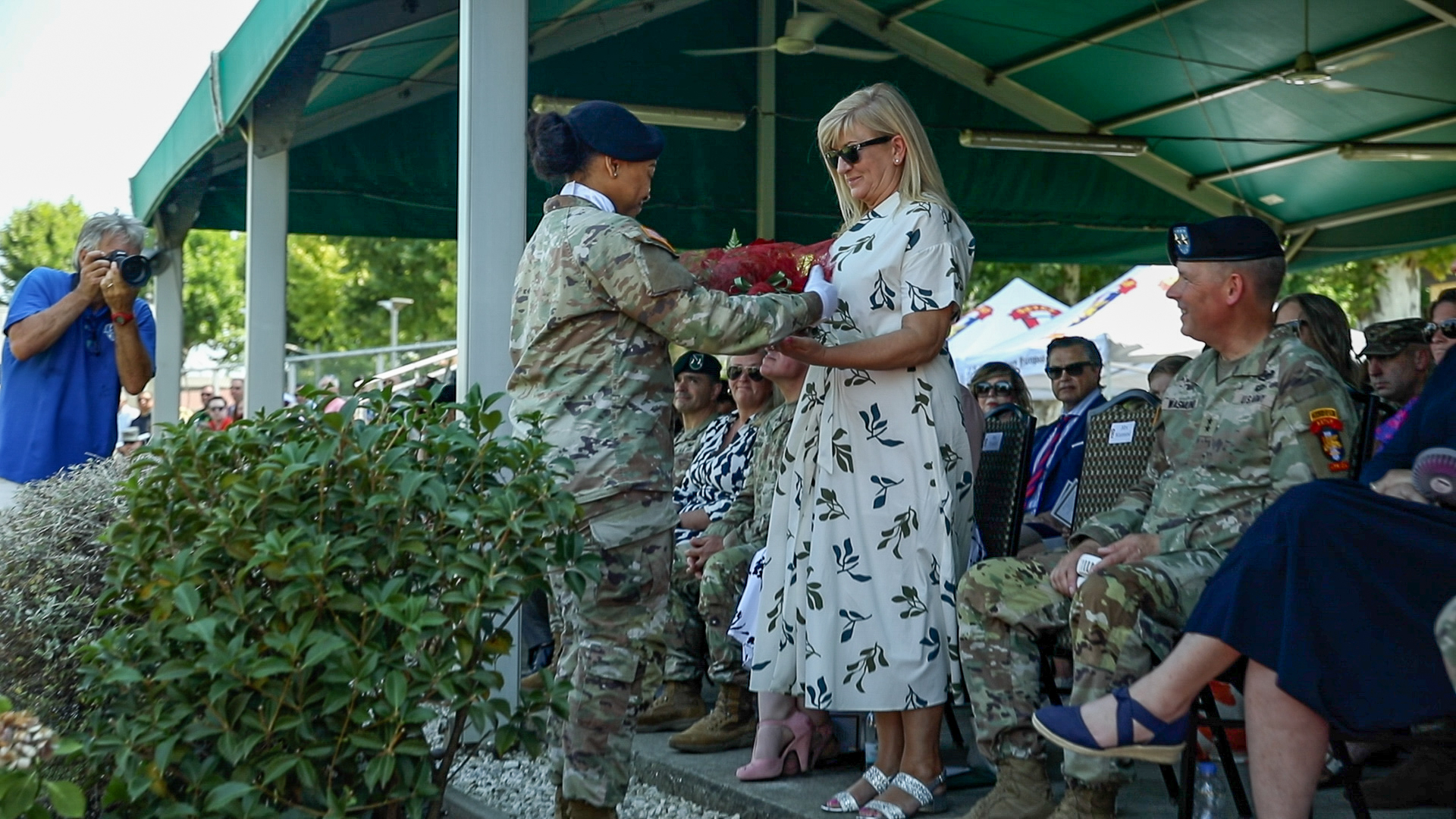 Tracy Wasmund, wife of U.S. Army Maj. Gen. Todd R. Wasmund, outgoing commanding general, U.S. Army Southern European Task Force, Africa (SETAF-AF), receives a bouquet of flowers during the change of command ceremony at Caserma Ederle, Vicenza, Italy, July 18, 2024. U.S. Army Maj. Gen. Andrew C. Gainey replaces Wasmund as the new incoming commanding general of SETAF-AF. The change of command ceremony is a military tradition that represents a transfer of authority and responsibility for a unit or command. SETAF-AF provides U.S. Africa Command and U.S. Army Europe and Africa a dedicated headquarters to synchronize Army activities in Africa and scalable crisis response options in Africa and Europe (U.S. Army photo by Spc. Christopher Sanchez)