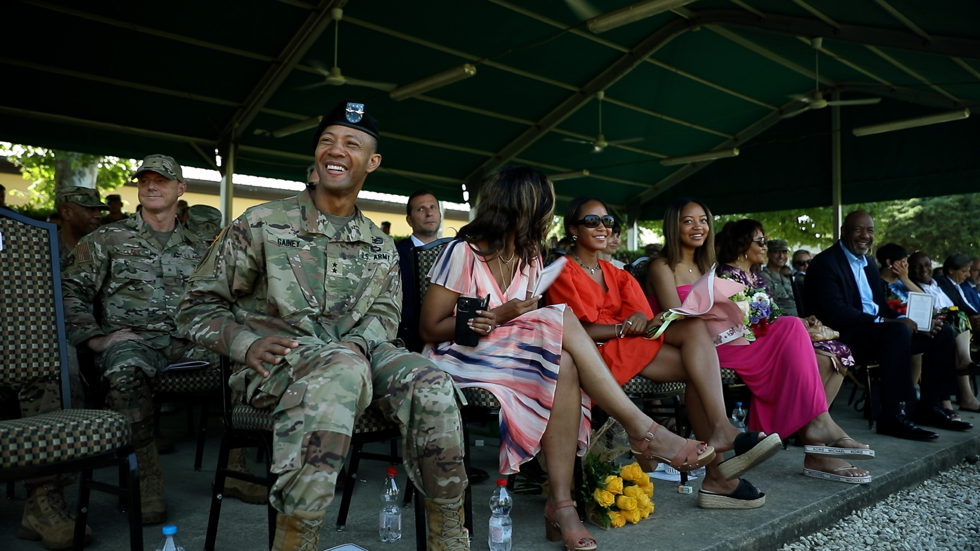 U.S. Army Maj. Gen. Andrew C. Gainey smiles from his seat, along with his family, during a change of command ceremony for U.S. Army Southern European Task Force, Africa (SETAF-AF), at Caserma Ederle, Vicenza, Italy, July 18, 2024. Gainey replaces U.S. Army Maj. Gen. Todd R. Wasmund as the incoming commanding general of SETAF-AF. The change of command ceremony is a military tradition that represents a transfer of authority and responsibility for a unit or command. SETAF-AF provides U.S. Africa Command and U.S. Army Europe and Africa a dedicated headquarters to synchronize Army activities in Africa and scalable crisis response options in Africa and Europe (U.S. Army photo by Spc. Christopher Sanchez)