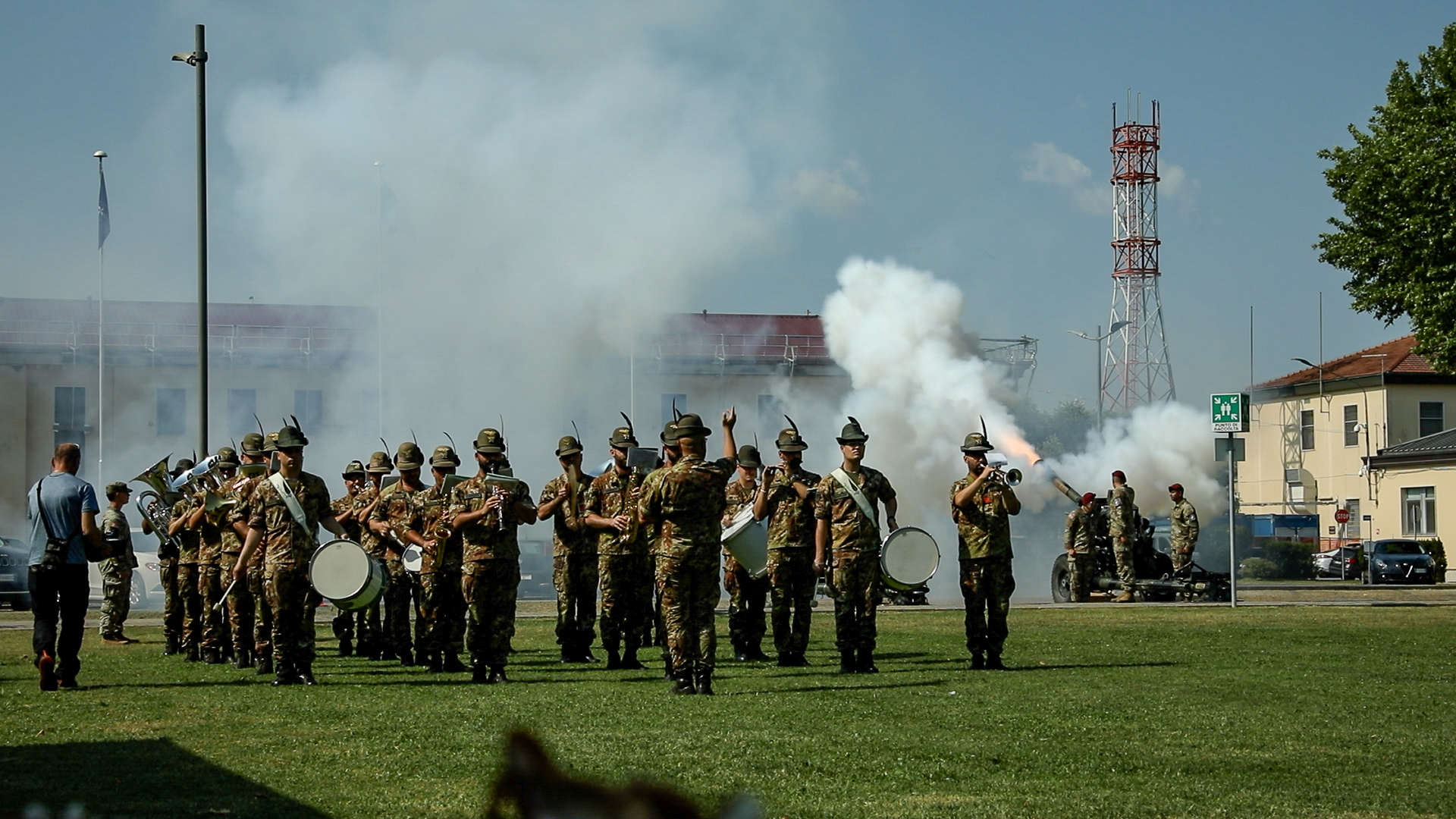 The Italian band “Fanfara della Brigata Alpini Julia” stands firm as members of 4th Battalion, 319th Airborne Field Artillery Regiment, 173rd Airborne Brigade, fire a simulation round during a change of command ceremony for U.S. Army Southern European Task Force, Africa (SETAF-AF) at Caserma Ederle, Vicenza, Italy, July 18, 2024. U.S. Army Maj. Gen. Andrew C. Gainey replaces U.S. Army Maj. Gen. Todd R. Wasmund as the new incoming commanding general of SETAF-AF. The change of command ceremony is a military tradition that represents a transfer of authority and responsibility for a unit or command. SETAF-AF provides U.S. Africa Command and U.S. Army Europe and Africa a dedicated headquarters to synchronize Army activities in Africa and scalable crisis response options in Africa and Europe (U.S. Army photo by Spc. Christopher Sanchez)