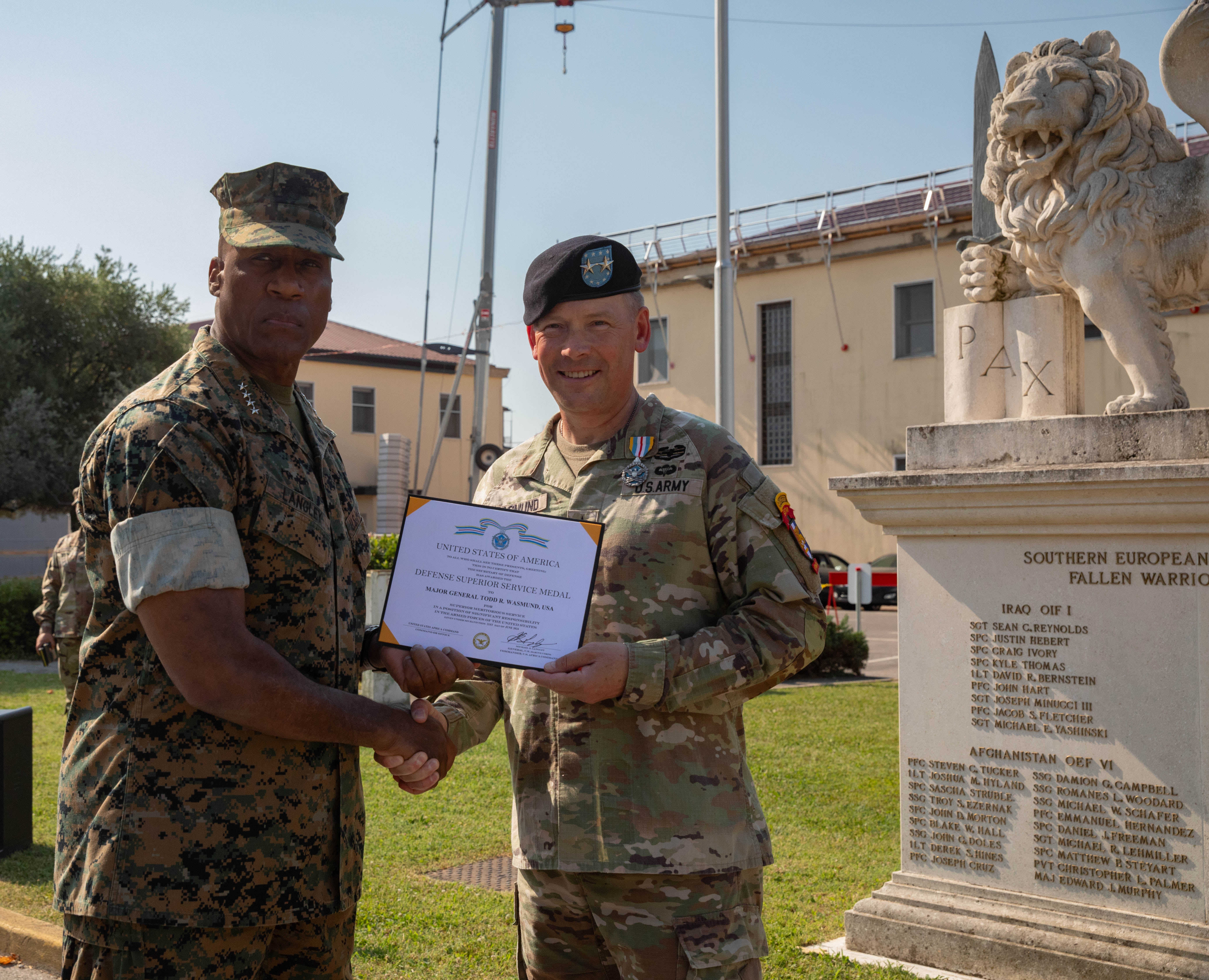 U.S. Marine Corps Gen. Michael E. Langley, commander, U.S. Africa Command, awards U.S. Army Maj. Gen. Todd R. Wasmund, outgoing commanding general, U.S. Army Southern European Task Force Africa, Africa (SETAF-AF) the Defense Superior Service medal at Caserma Ederle, Vicenza, Italy, July 18, 2024. SETAF-AF provides U.S. Africa Command and U.S. Army Europe and Africa a dedicated headquarters to synchronize Army activities in Africa and scalable crisis response options in Africa and Europe. (U.S. Army photo by Sgt. Alisha Grezlik)